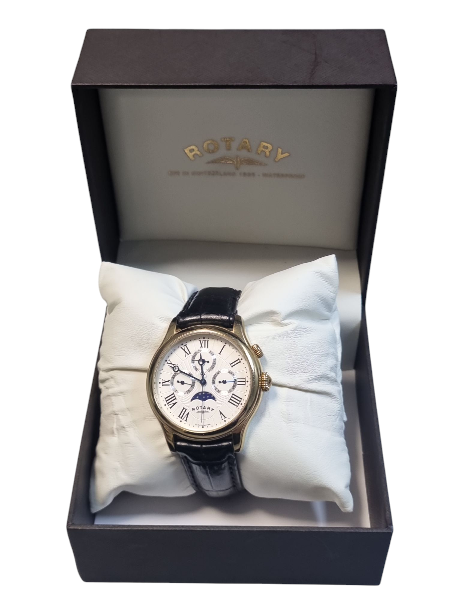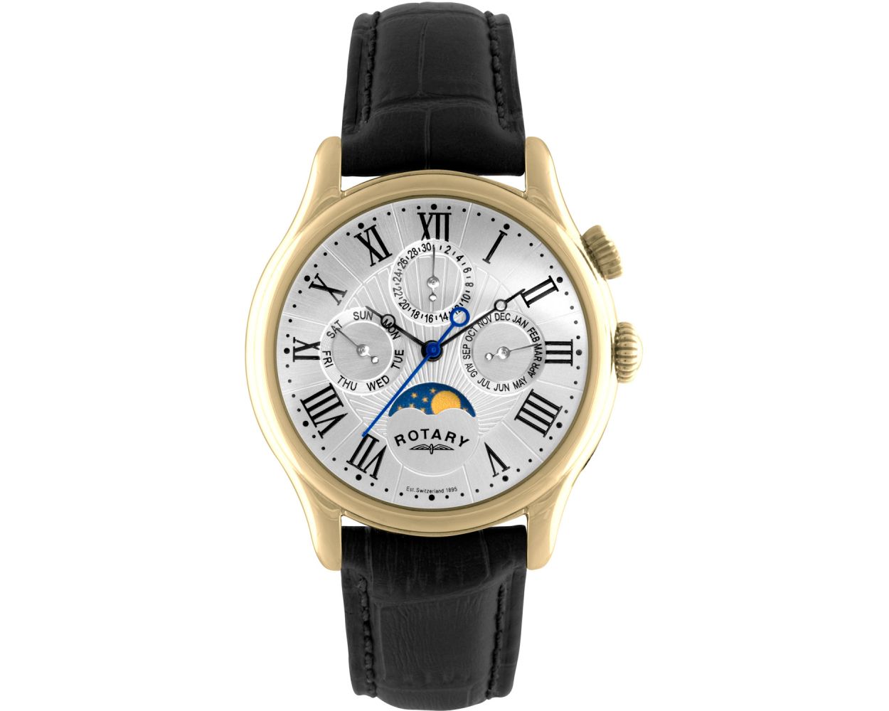 More Information Limited edition No Movement Quartz Case Material Gold PVD Steel Glass Mineral Dial Colour Silver Clasp Type Standard Pin Buckle Water Resistance Splashproof Day No Date No Chronograph No Alarm No Extra Features Day, Date, Month, Moon Dial Case Width (mm) 38 Case Depth (mm) 10 Alternative Model No. GS02839_01 Packaging Original Rotary Packaging Guarantee 2 Year Rotary Guarantee Bracelet Adjustable No Face Shape Round Strap Type Leather