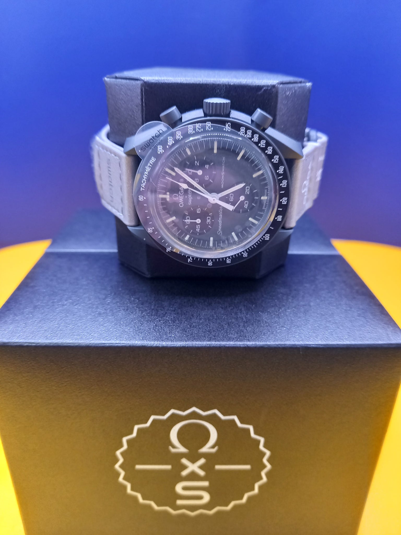 Experience uncompromising professionalism with this watch's commanding deep grey hue and metallic VELCRO strap. The white chronograph seconds hand, subdial hands, and tachymeter scale offer striking contrast against a black subdial and bezel background. Dials proudly display OMEGA X SWATCH branding, the iconic Speedmaster logo, and the new MoonSwatch emblem. Precision abounds, from the concealed "hidden" S beneath the crystal to the circular pattern on the dial's outer ring and subdials. Sharp lugs, the "dot over 90" on the tachymeter bezel, and unique Bioceramic touch reflect dedication to detail. Superluminova illuminates hour markers, hands, and chronograph seconds for a radiant glow in the dark. The Mission to Mercury captures these elements, adorning your wrist with sophistication, precision, and a touch of cosmic beauty.