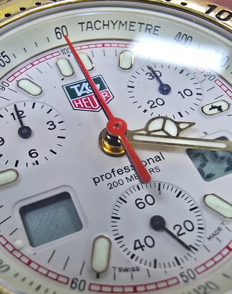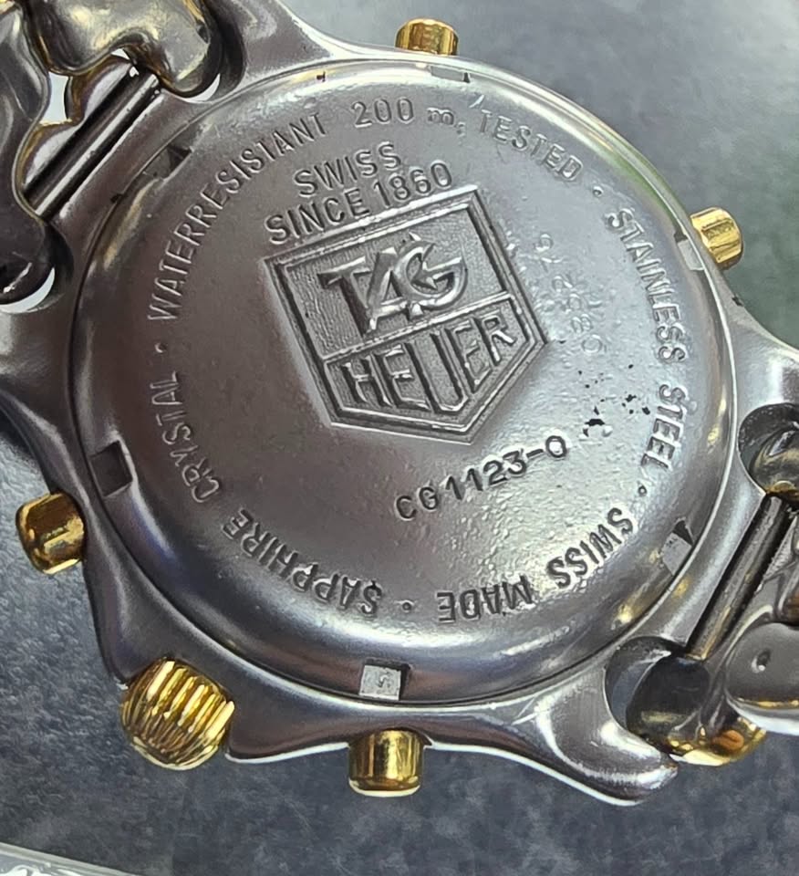 S/EL, or Sports Elegance, was a long running design by TAG Heuer for the late 80’s and 1990’s. The S/EL must be one of the easiest to recognise models from the 1990’s, helped by advertising that included Ayrton Senna. As well as a full 200M divers specification, this chronograph has no fewer than seven hands as it can measure 1/10th of a second, seconds, minutes, and up to 12 hours (as well as the three time telling hands). You also get a quick set date at 4, and sapphire crystal. Everything is working correctly, and we will install a brand new battery before sending the watch out to the new owner. Cosmetically this is in very good order too, and the 60 bezel clicks positively.