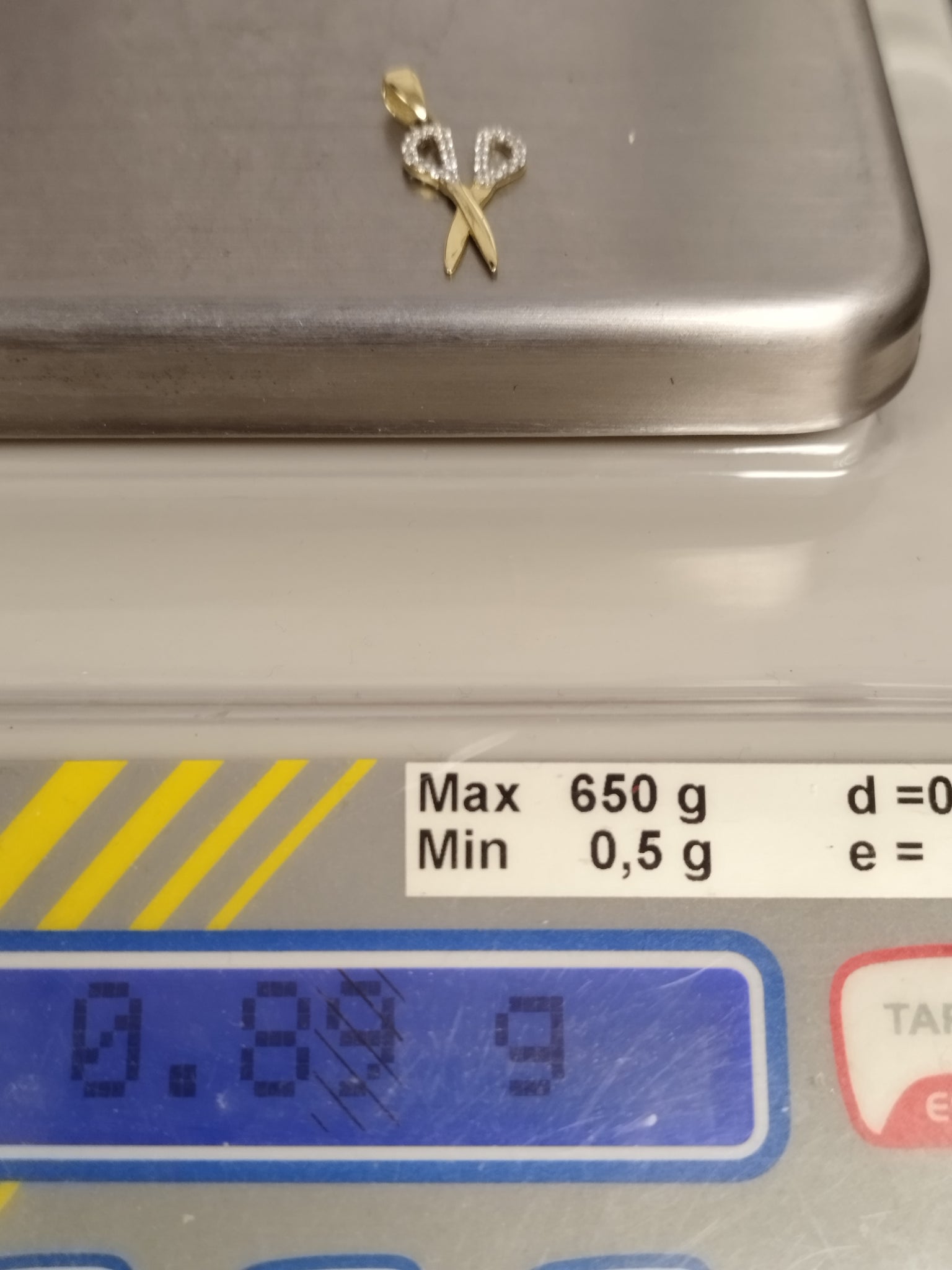 A lovely 14ct yellow gold scissors pendant set with clear stones.
