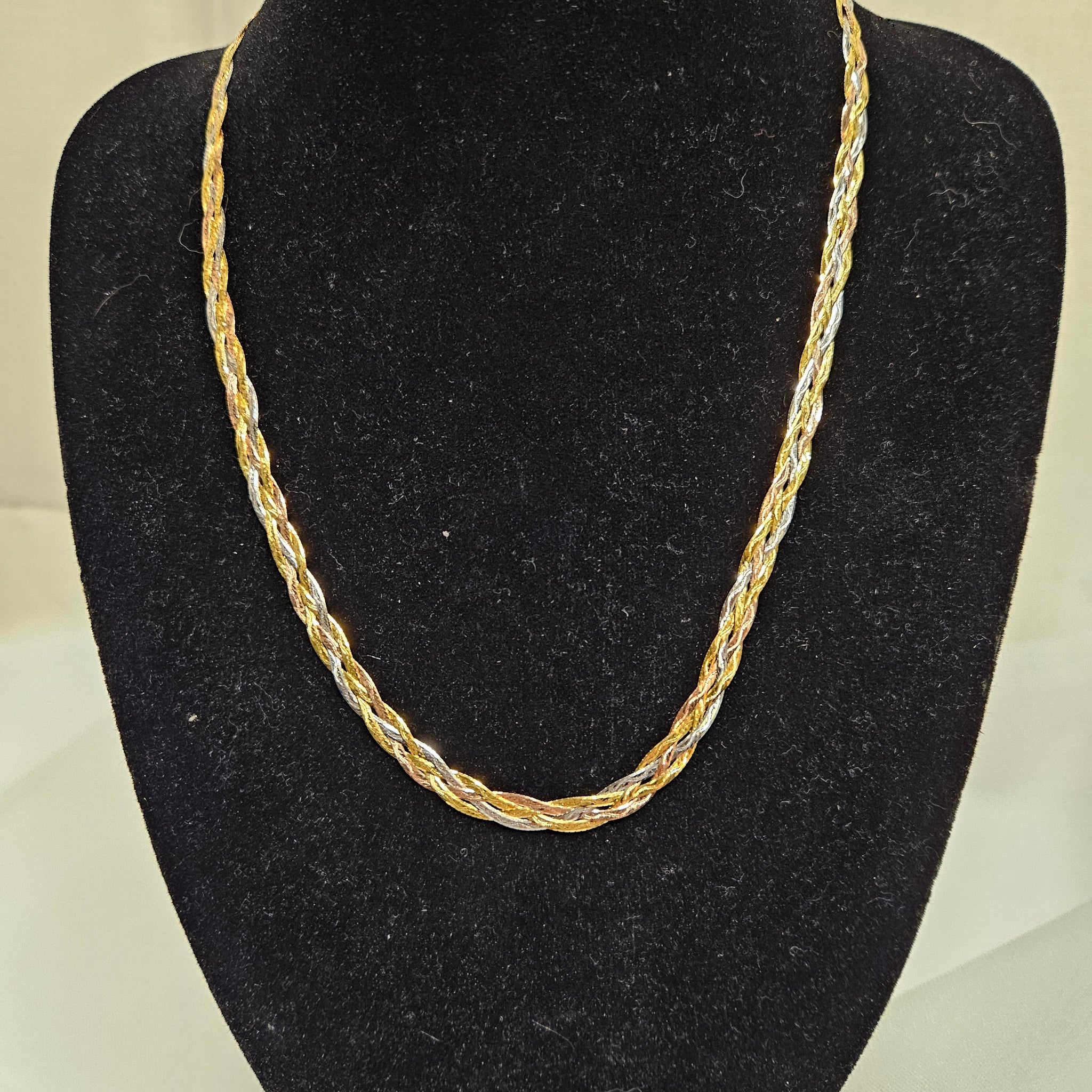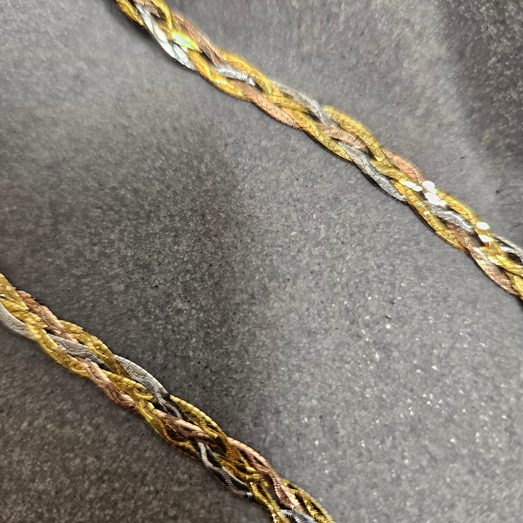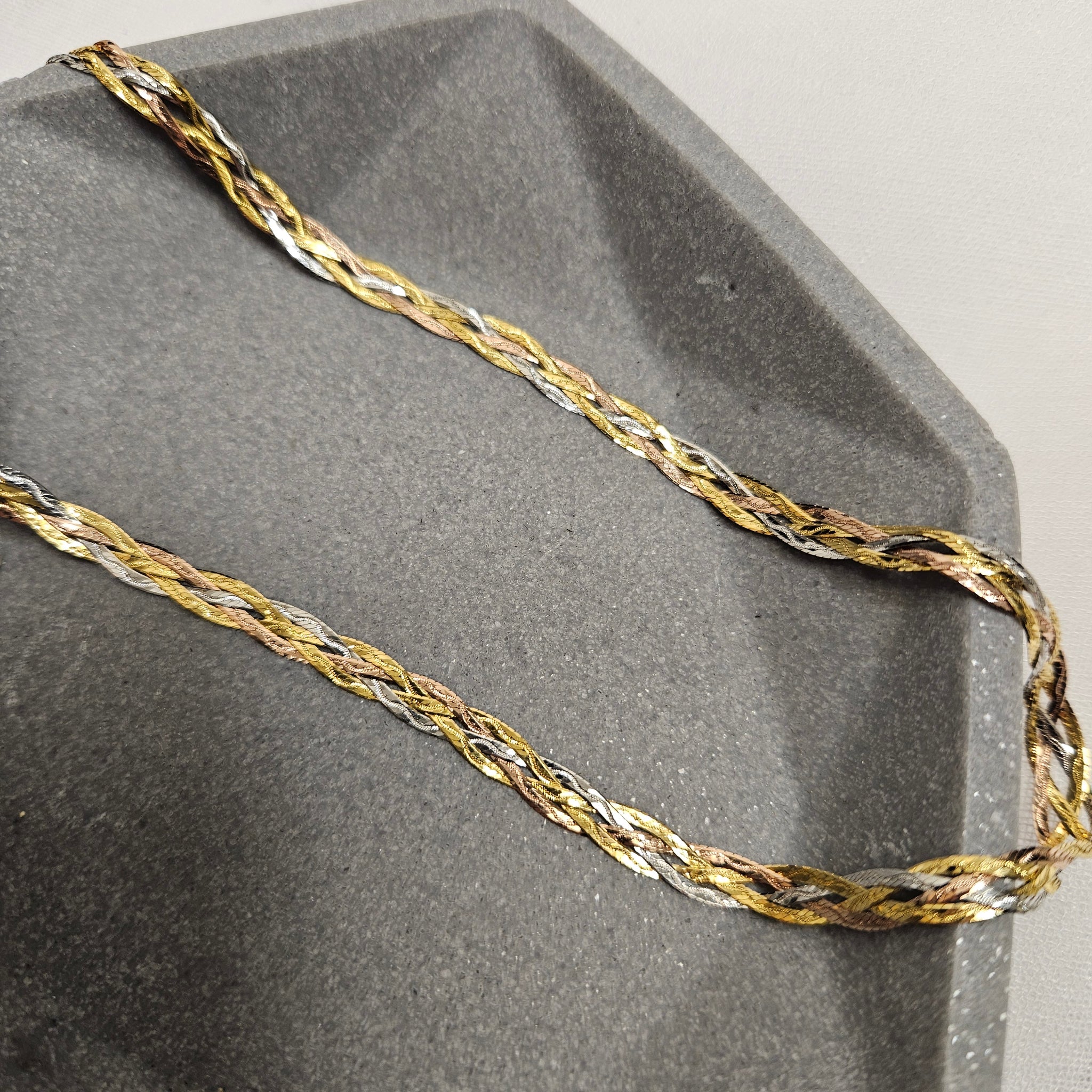 This stunning piece is platted with 9ct in a trio of colours - yellow gold, rose gold and white gold. It is eye catching and delicate. Will be sent in a gift box and tracked delivery via Royal mail.