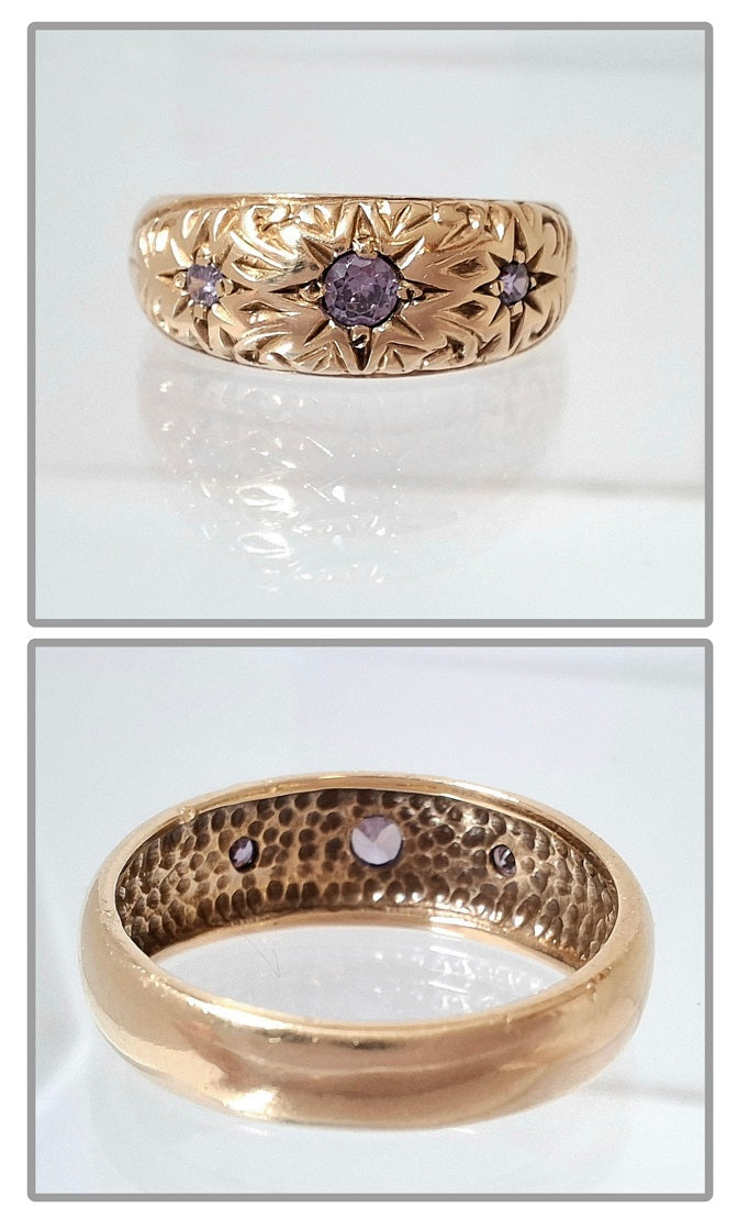 9 Carat Gold - Yellow Gold - Ring - Lovely Star Design Carved in with 3 Light Pink/Purple stones for the Center's - Full Hallmark - Total weight including stones is 4.32 Grams - Size Q/R - This item is Unboxed - Sent using Royal Mail Tracked if Purchased for Home delivery