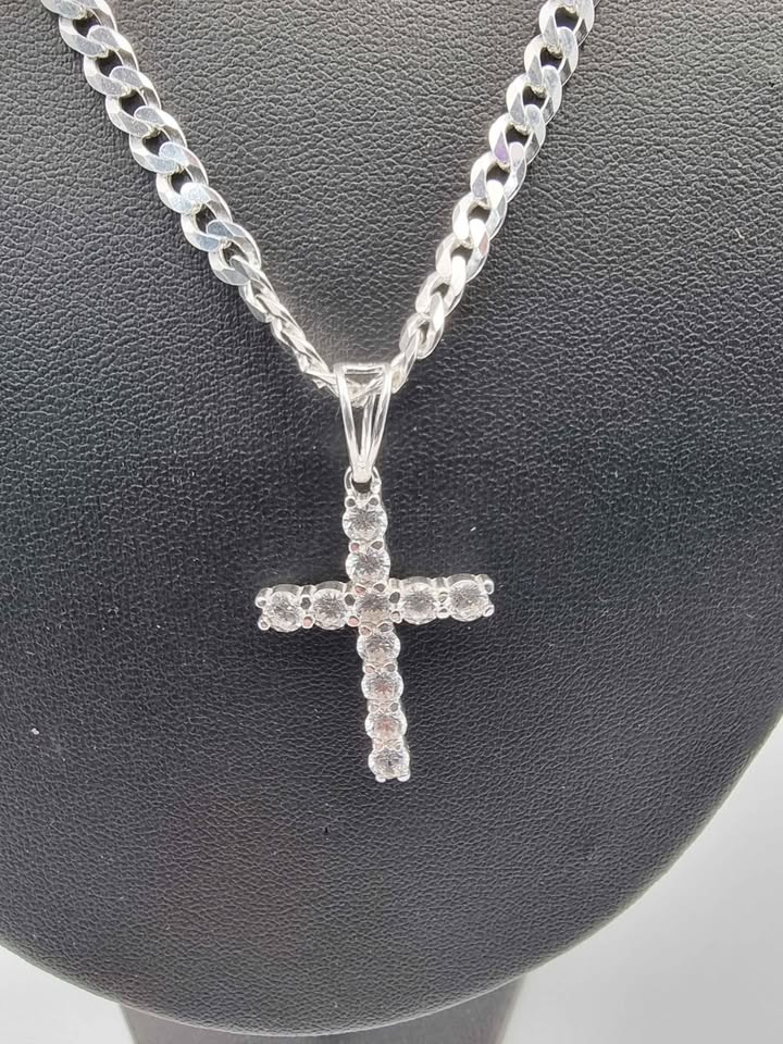 925 Sterling Silver Curb Chain Necklace With CZ Cross Pendant - 24" Long - 22.46 Grams **BRAND NEW**