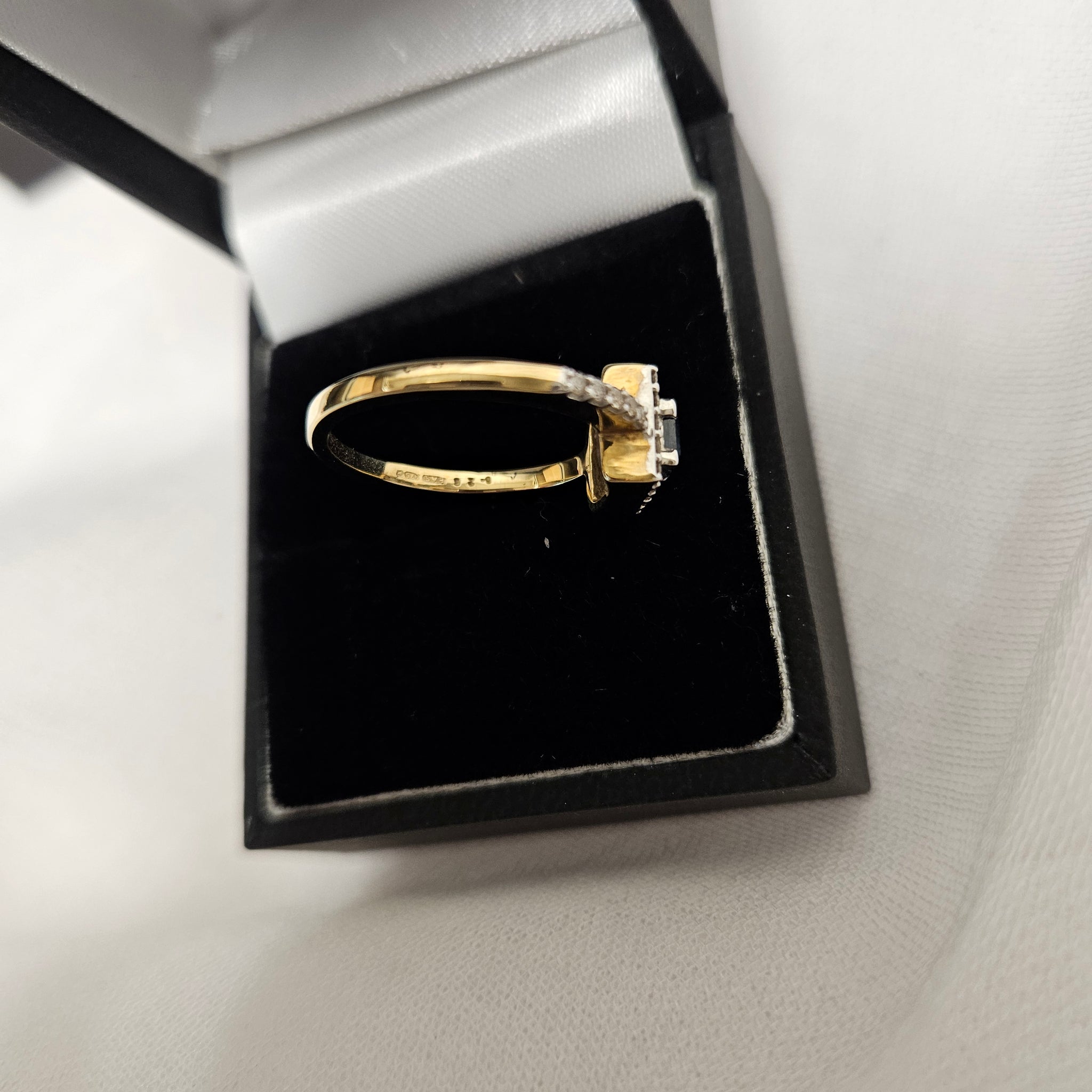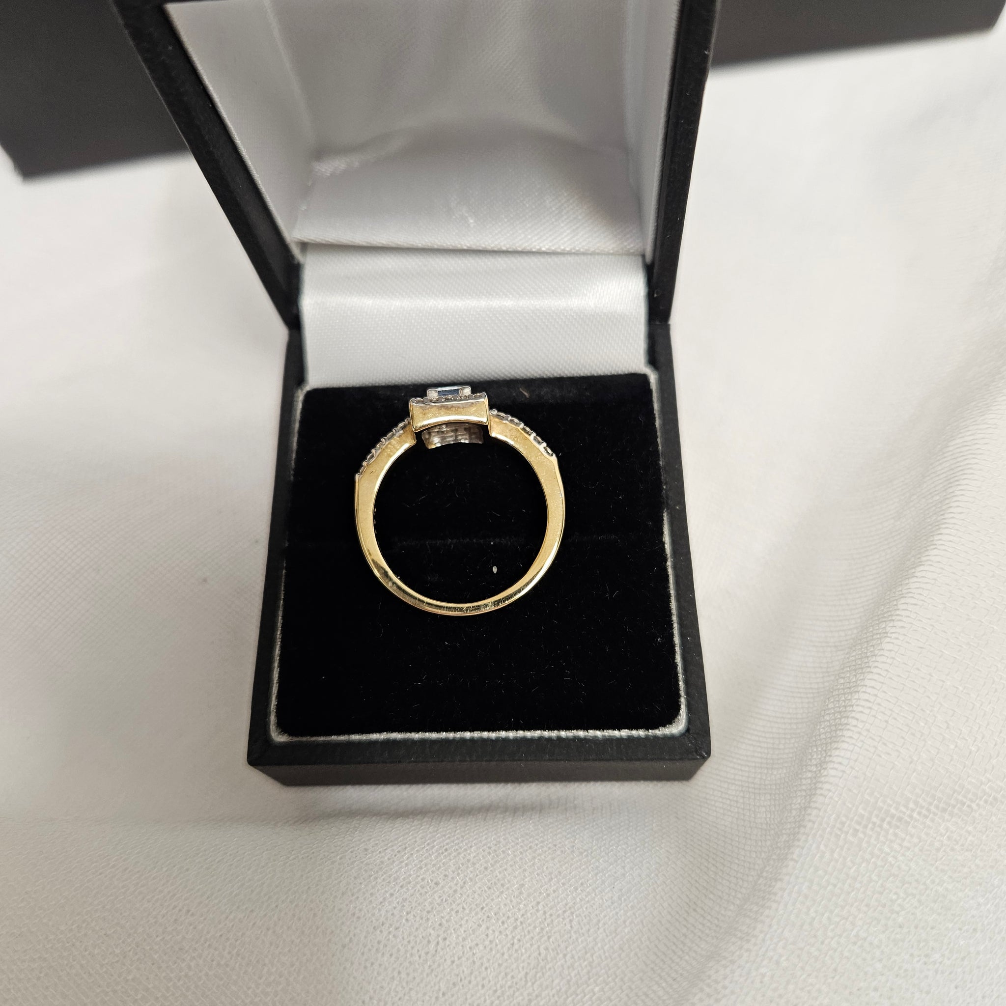This stunning ring is set in 9ct yellow gold with a square sapphire set in the middle of a square of diamonds which the trail down the arms. It is absolutely beautiful and weighs a total of 2.9g. Will be sent tracked delivery and wrapped to ensure safe delivery.