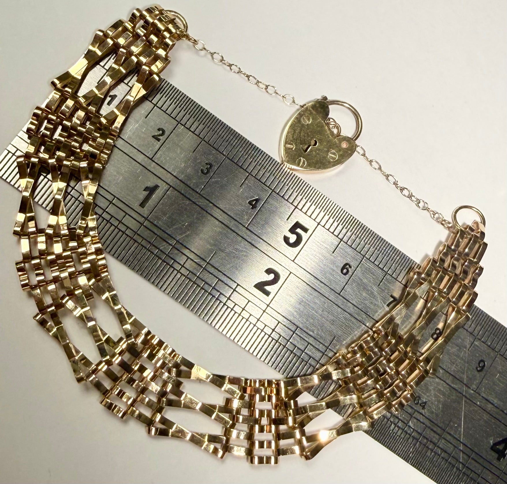 9CT Gold Multi-Row Gate Bracelet with Heart Clasp ***This is in good condition with light cosmetic wear. The weight is 8.23 grams and for the size please refer to the photos. ***For any queries please call our Chorley store direct from Mon-Sat on 01257 752333.