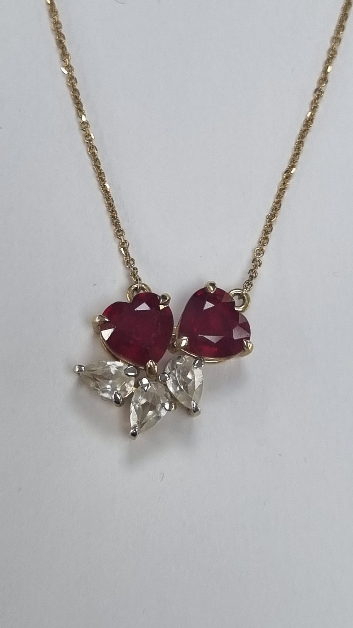 9ct gold necklace, this is 18" in length. Chain is adjustable down to 16". This is 9ct gold. Red stones, heart shaped and clear stones. 9ct pendant. Weighs a total of 5.20grams. In good condition