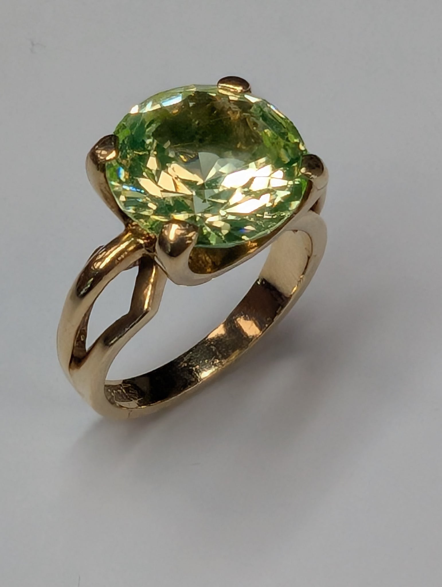 A beautiful unique 9ct gold ring with a large lime green stone, this weighs 5.9 grams and is a size M