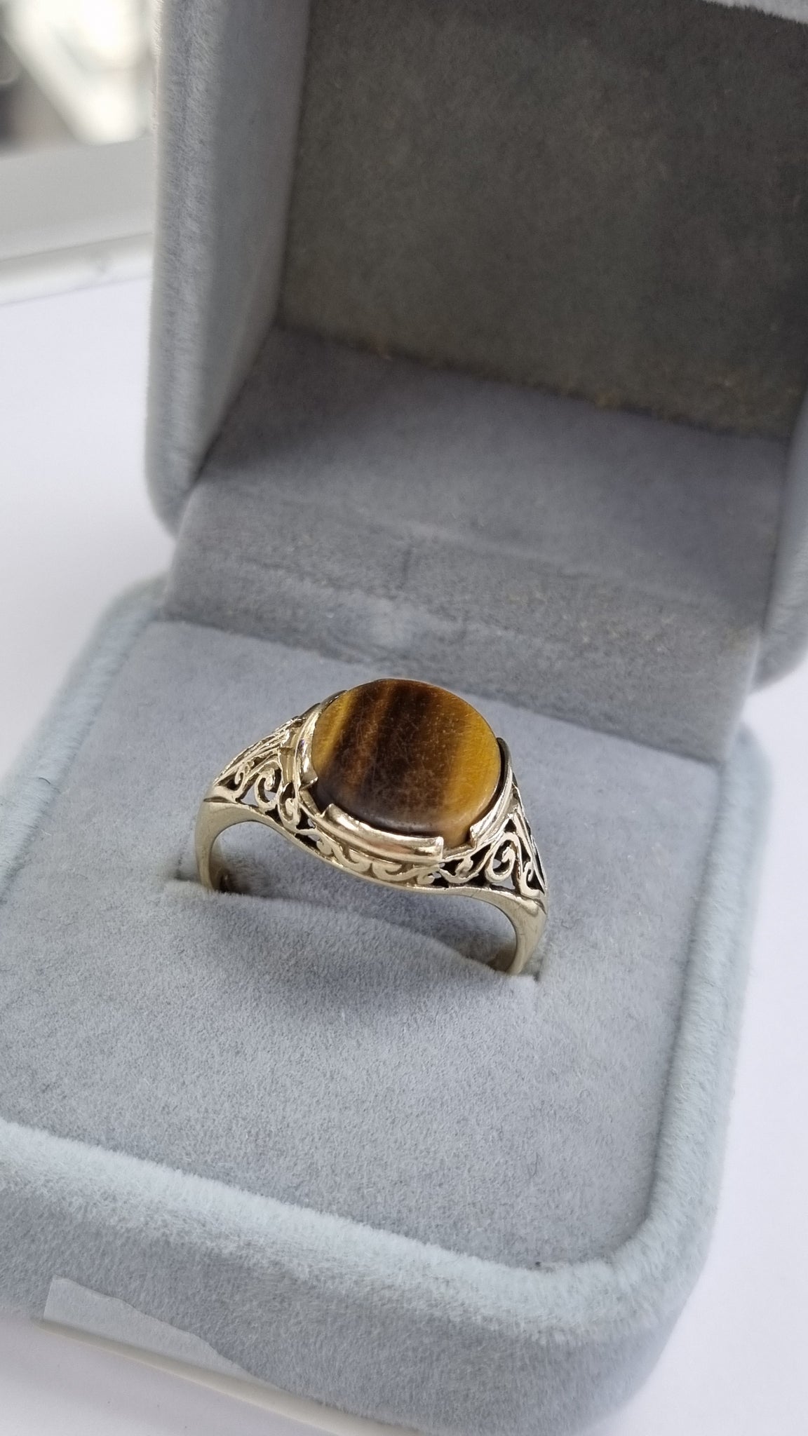9ct gold ring, with large tigers eye stone. Stone has minor cosmetic marks from wearing overtime. Overall this is a nice peice. Size R. Weighs 3.90grams in total.