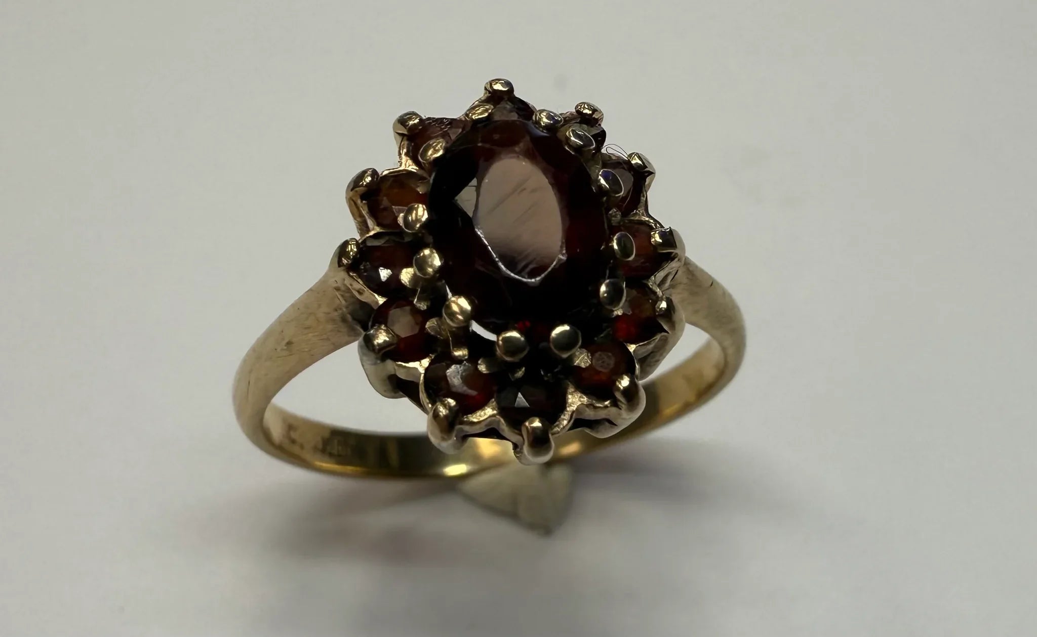 9CT YELLOW GOLD GARNET RING, IN GOOD CONDITION, HAS A TOTAL WEIGHT OF 2.6 GRAMS AND IS A SIZE N