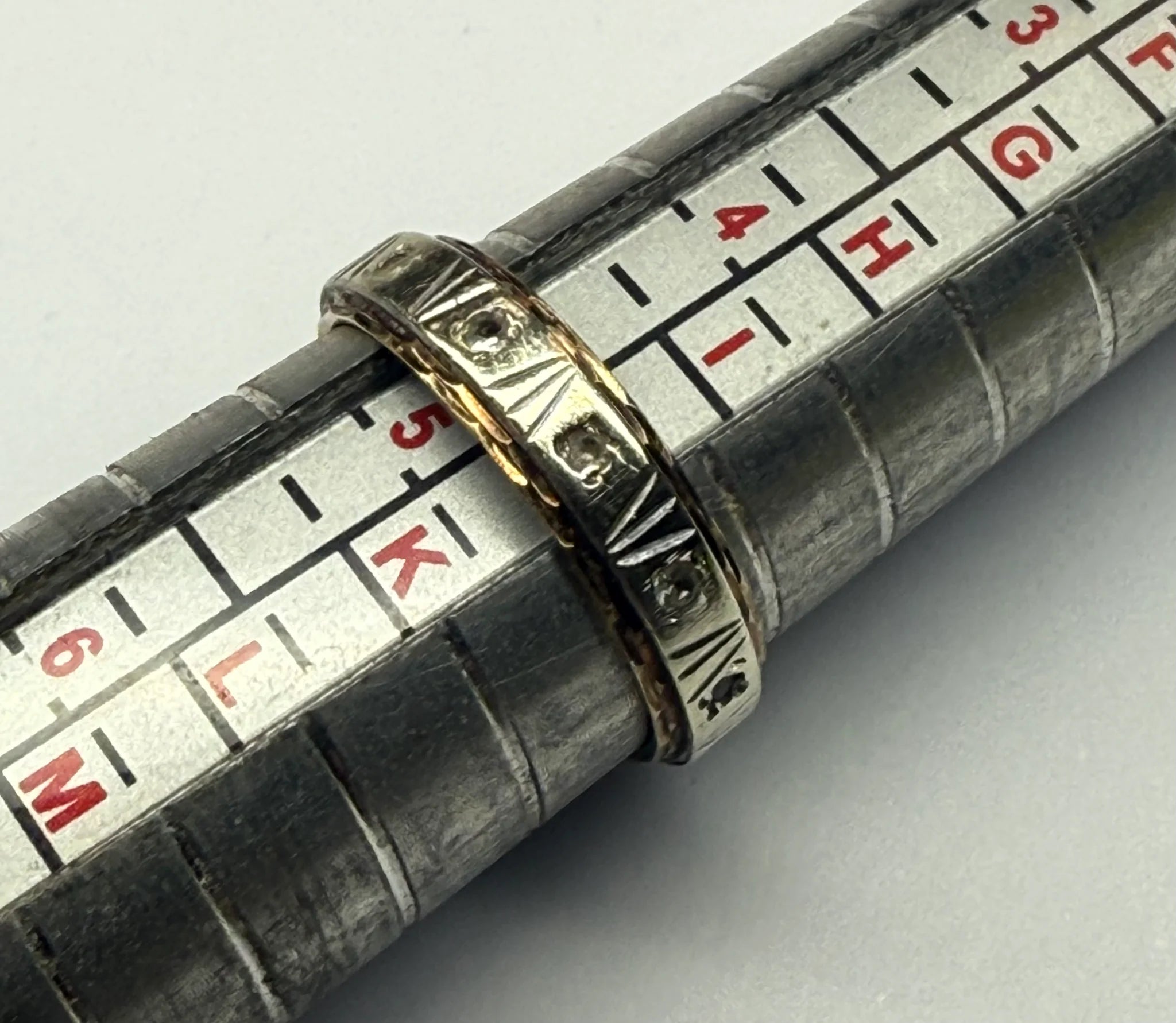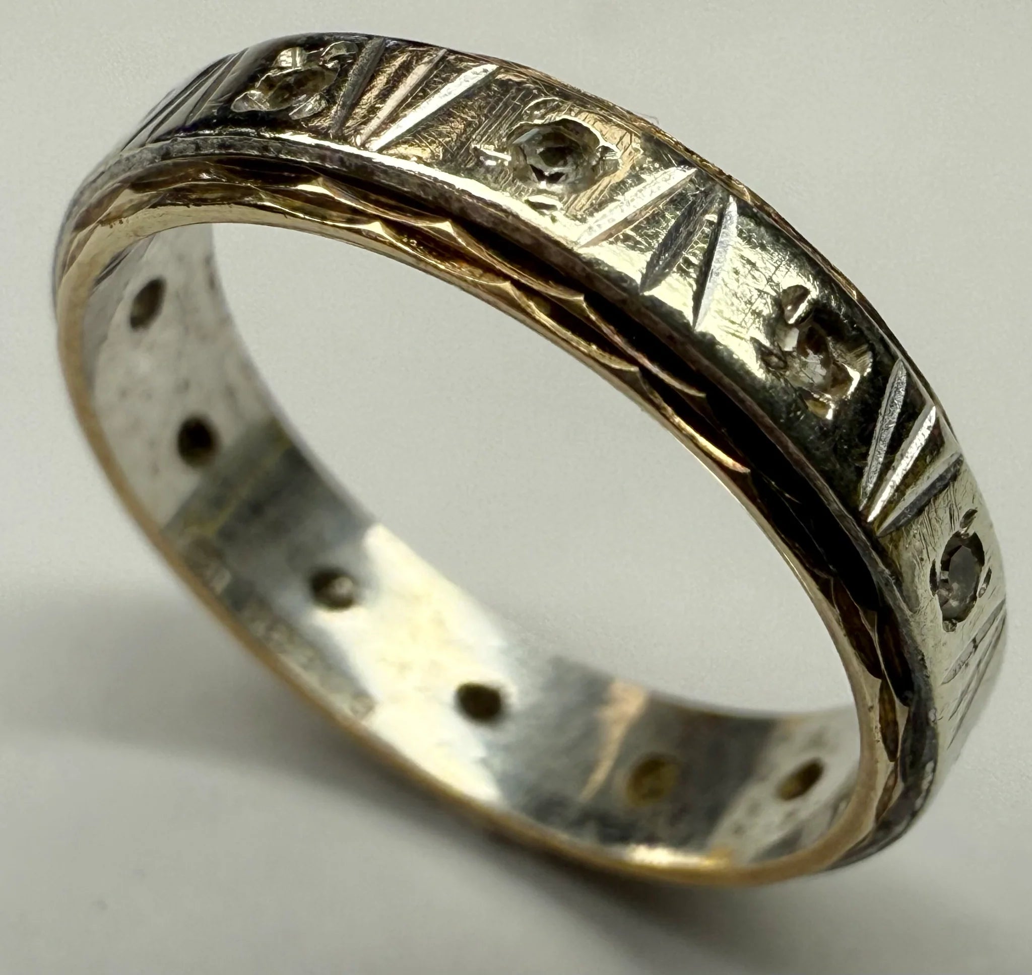 This beautiful 9ct white and yellow gold wedding band with pretty stones is in good condition is a size J and weighs 1.9 grams