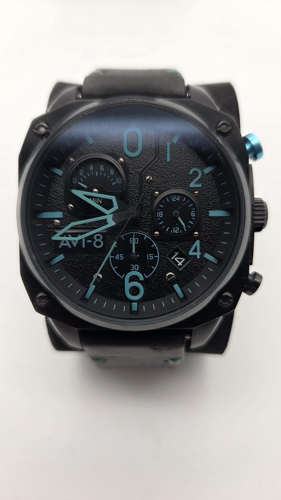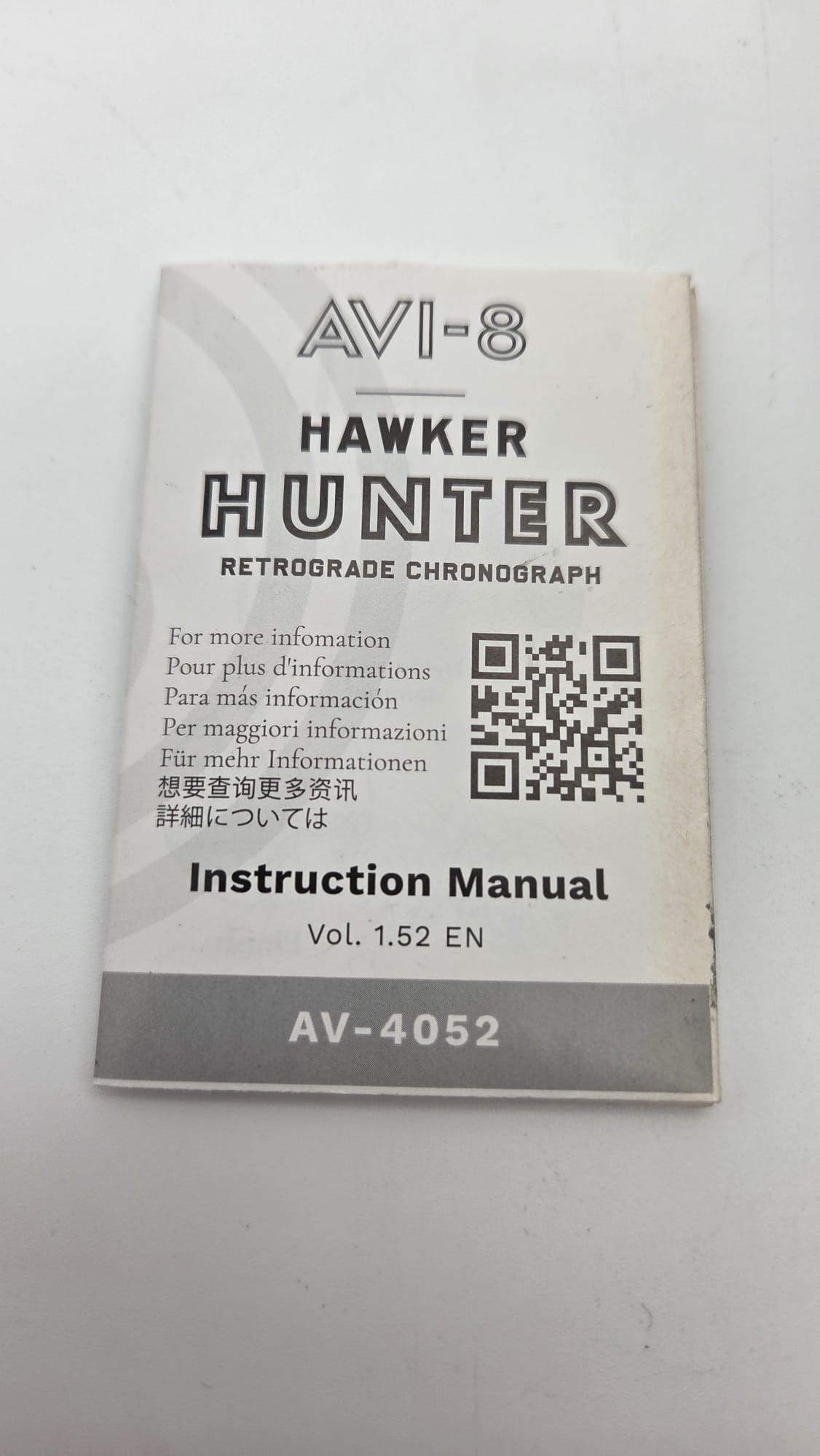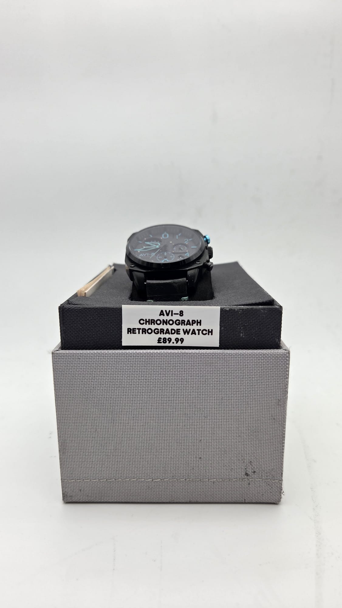 This watch is the Avi-8 Hawker hunter retrograde chronograph. It is the black and blue model. It comes in its box with the manual. The watch itself is in very good condition with no apparent damage, dings, scrapes, etc. The box however does look a bit tired, but it isn't falling apart.