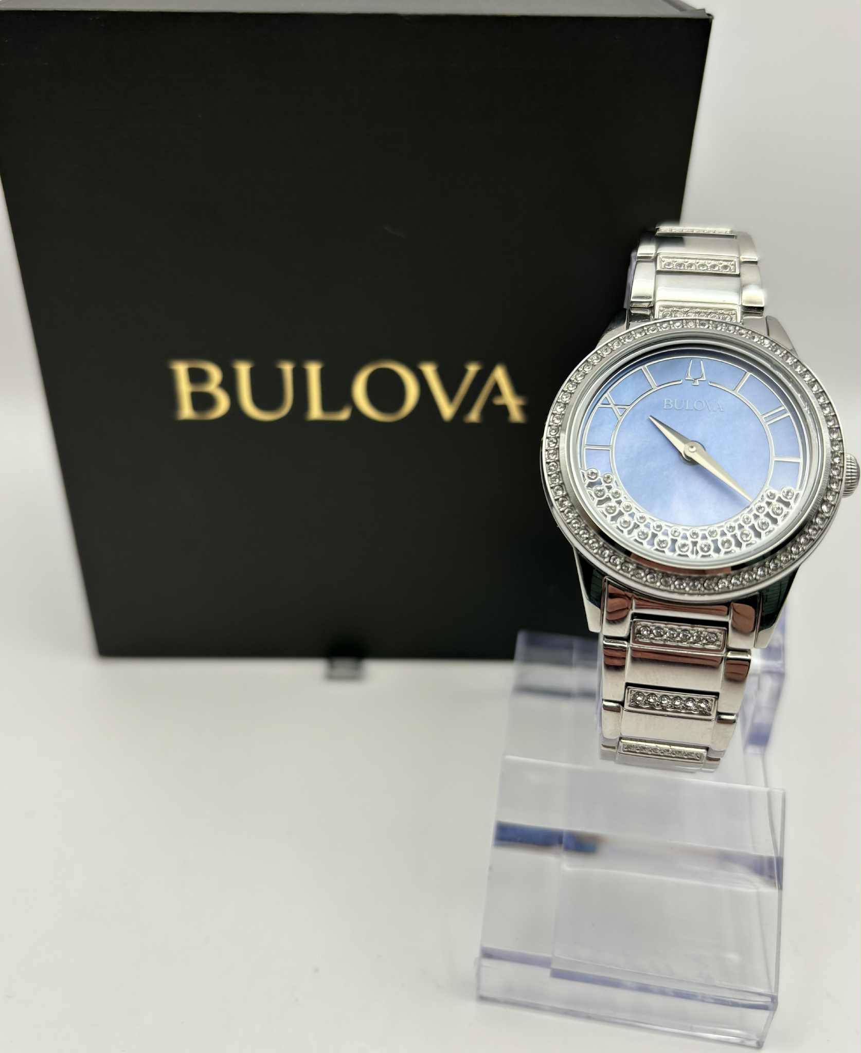 Silver-tone stainless steel case with a silver-tone stainless steel bracelet. Fixed- set with swarovski crystals bezel. Periwinkle mother of pearl dial with silver-tone hands and index hour markers. Dial Type: Analog. Quartz movement. Scratch resistant mineral crystal. Pull / push crown. Solid case back. Round case shape, case size: 32.5 mm, case thickness: 9.2 mm. Deployant clasp. Water resistant at 30 meters / 100 feet. Functions: hour, minute. Additional Info: embellished with 139 hand-set swarovski crystals. Dress watch style. Bulova TurnStyle Periwinkle Mother of Pearl Crystal Dial Ladies Watch 96L260.