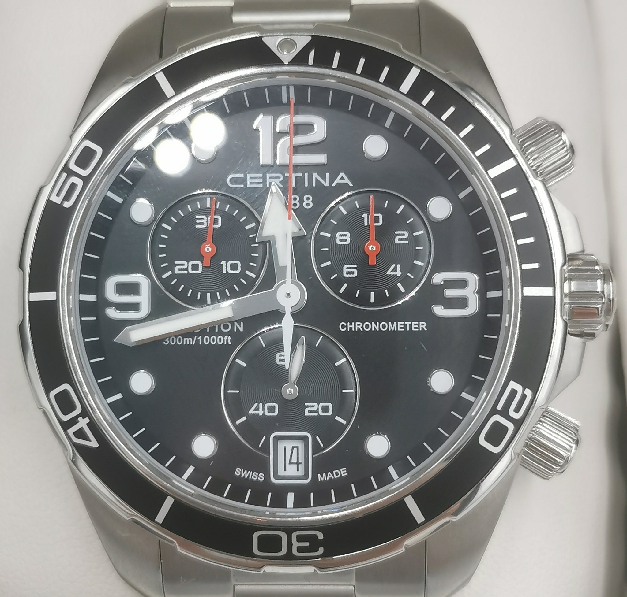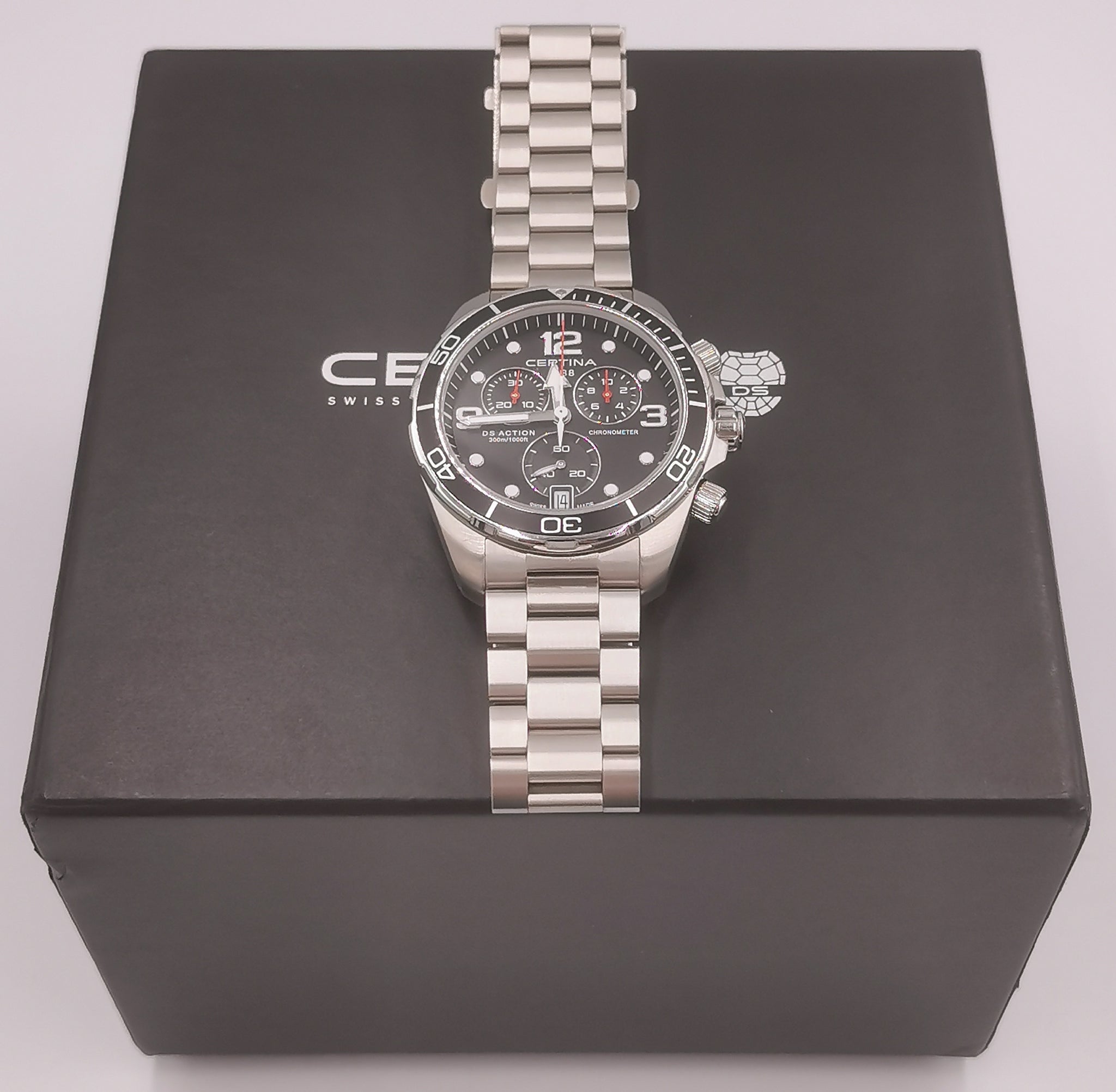 Certina DS Action Chronograph 43mm Quartz Men's Watch- Black Dial/Steel Bracelet - Boxed - 300 M WR, SWISS Made, SWISS Quartz Movement, Chronograph, Calendar, Sapphire Crystal