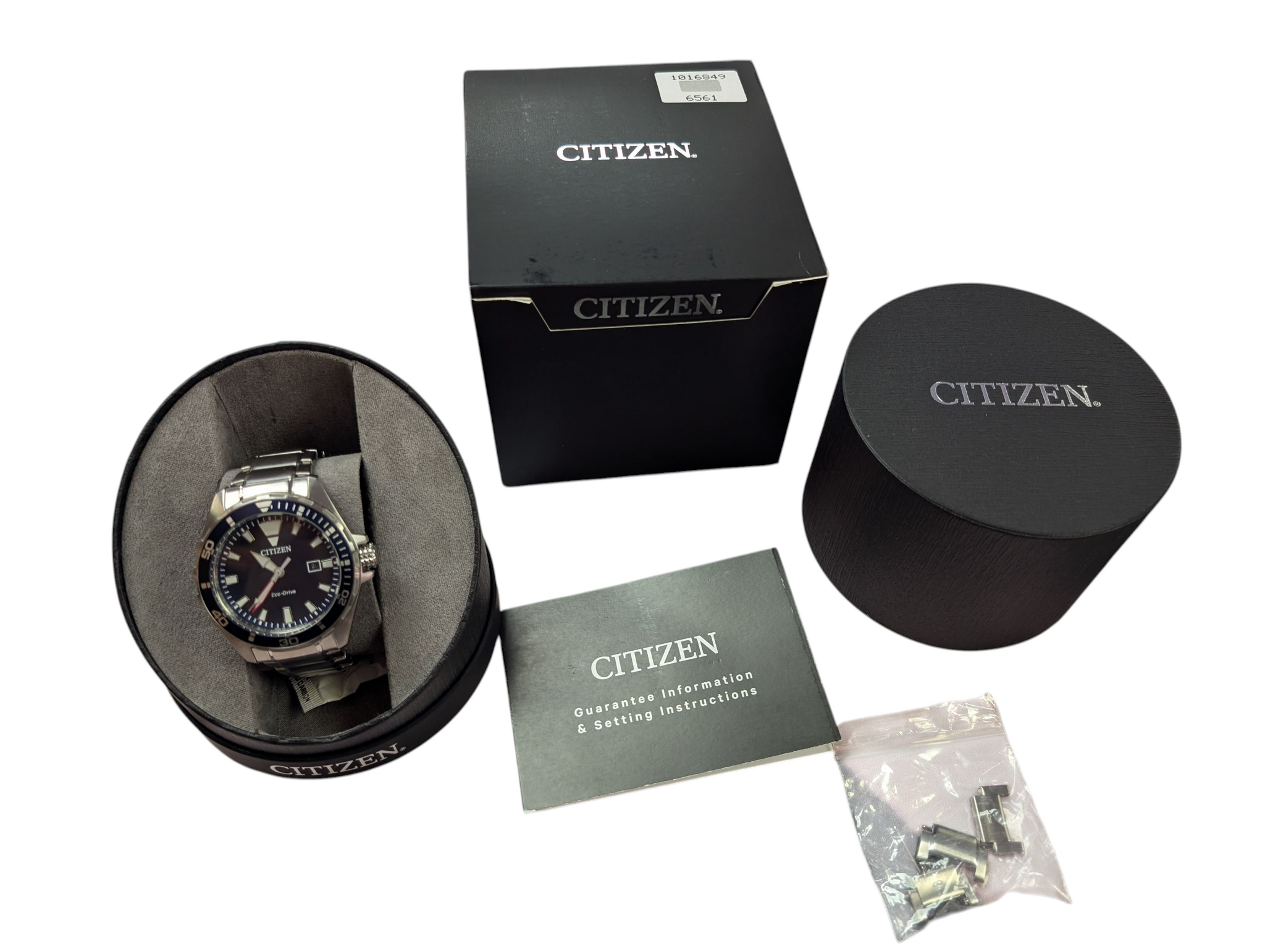 HERE WE HAVE A GENTS CITIZEN ECO DRIVE WATCH BOXED IN VERY GOOD CONDITION. THIS INCLUDES ADDITIONAL LINKS AND BOOKLET. ***** FOR ANY QUERIES PLEASE CALL OUR PRESTON STORE DIRECT MON-SAT 01772 204889
