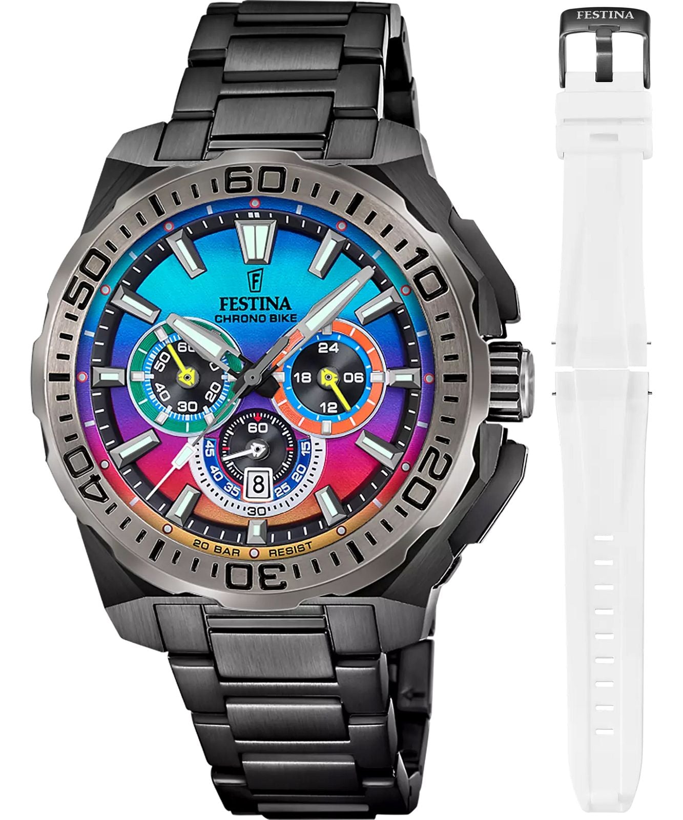 The Festina Chrono Bike 2025 Limited Edition SET F20731-2 is a limited edition model available with an additional rubber white strap. The black PVD-coated stainless steel envelope conceals a Miyota OS20 quartz movement and a color dial with chronograph and date function. The watch features a sapphire glass with high scratch resistance and a water resistance of 200 meters, which allows the watch to be used while swimming or diving.