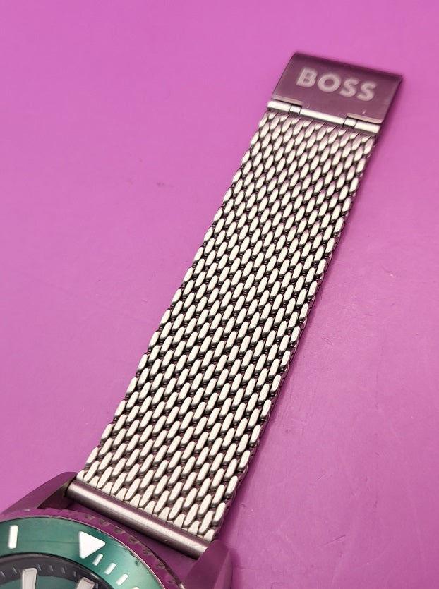 The BOSS Mens Admiral Watch combines a 45mm round shaped stainless steel case and a stainless steel mesh bracelet with a fold over clasp. It has a green chronograph display dial with luminescent hands and hour markers and a date window between four and five o-clock, which is protected beneath mineral crystal glass. Power is generated by the quartz movement. This model also has a water resistance of up to 100 metres.