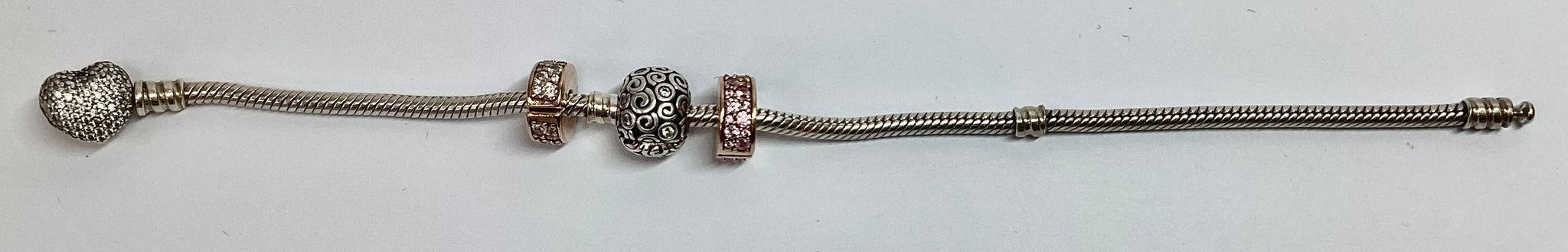 Stunning Pandora bracelet with 3 charms sized 7.5”