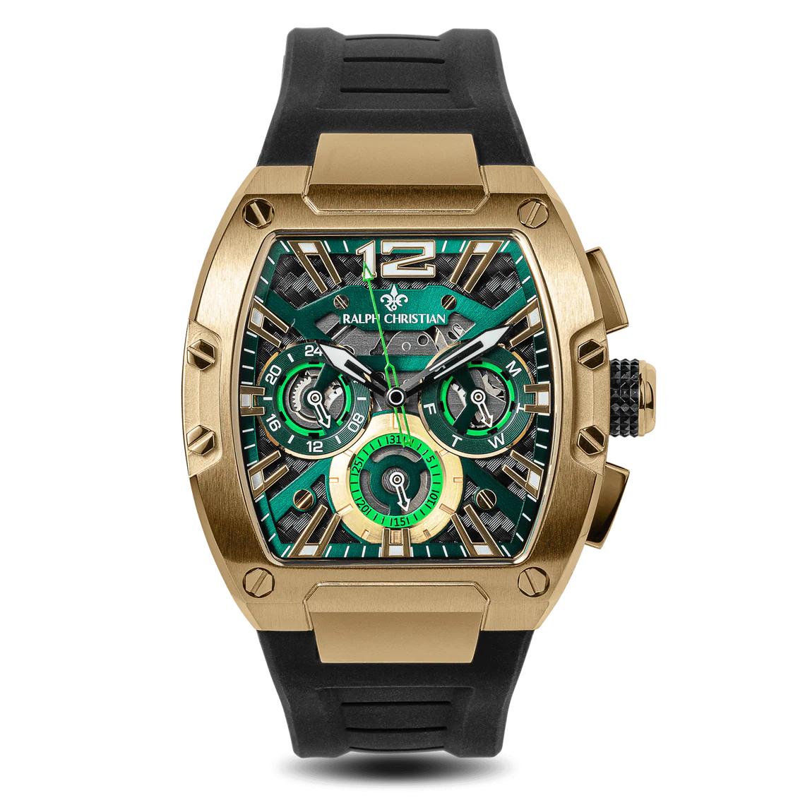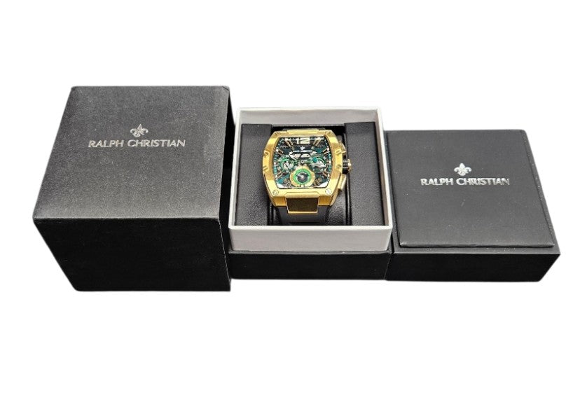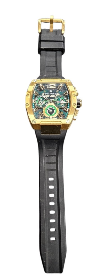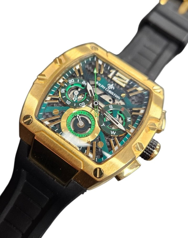 Case Feature: CASE Fully Stainless Steel Dial Feature: DIAL Part Skeletonized, Multi Layered Black & Gold Glass Feature: GLASS Sapphire Coated Curved Crystal Movement Feature: MOVEMENT High Precision Japanese Quartz Strap Feature: STRAP Premium Flexible & Durable Silicone Complications Feature: COMPLICATIONS 24-Hour Subdial, Day Function, Date Function Water Resistance Feature: WATER RESISTANCE 5 ATM Case Size Feature: CASE SIZE 42.5mm x 50mm Case Thickness Feature: CASE THICKNESS 13mm Length Feature: LENGTH Up To 235mm
