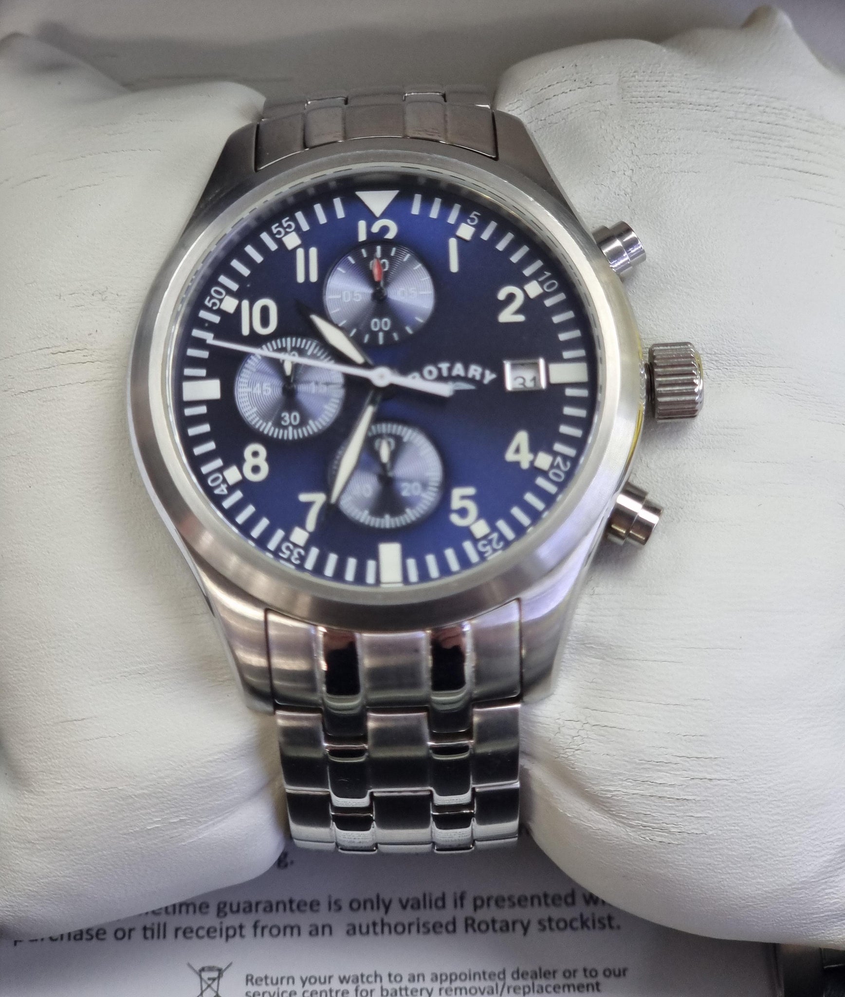 This Rotary watch is a contemporary piece built with a robust Stainless Steel 42mm case and 21mm bracelet. *The sleek blue sunray dial offers a striking visual contrast as well as featuring chronograph and date functionality. Designed with the active wearer in mind, this quartz-powered timepiece is water resistant at 100m and is finished with mineral glass and luminous hands and hour markers.* Band Colour Silver Band Width 21 Dial Colour Blue Water Resistant Up To 100m