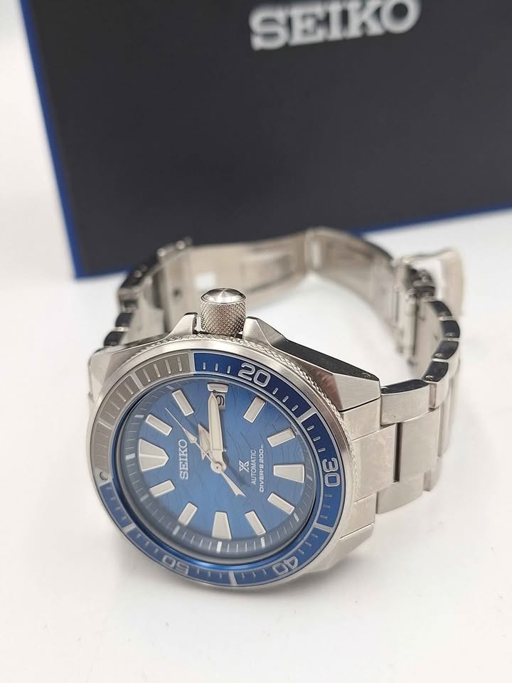 LIMITED EDITION GENTS SEIKO PROSPEX SAMURAI “Great White” SAVE THE OCEAN 4R35-03G0 VERY GOOD WORKING CONDITION WITH BOX/PAPERS. STAINLESS STEEL CASE AND BRACELET IN GOOD CONDITION, HAS SCRATCHES AND MARKS. MEASURES 48MM ACROSS INCLUDING CROWN. GLASS IN EXCELLENT CONDITION.