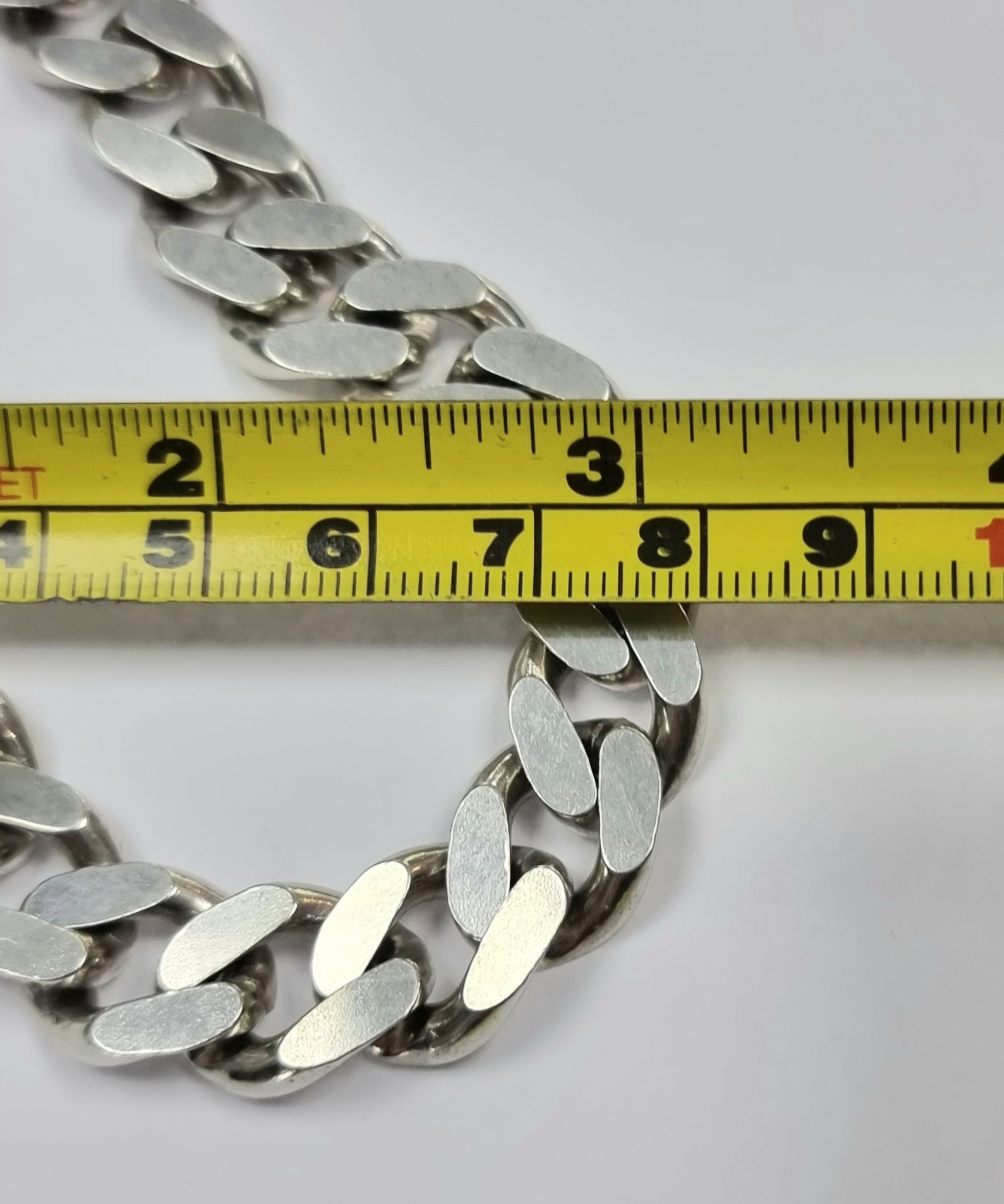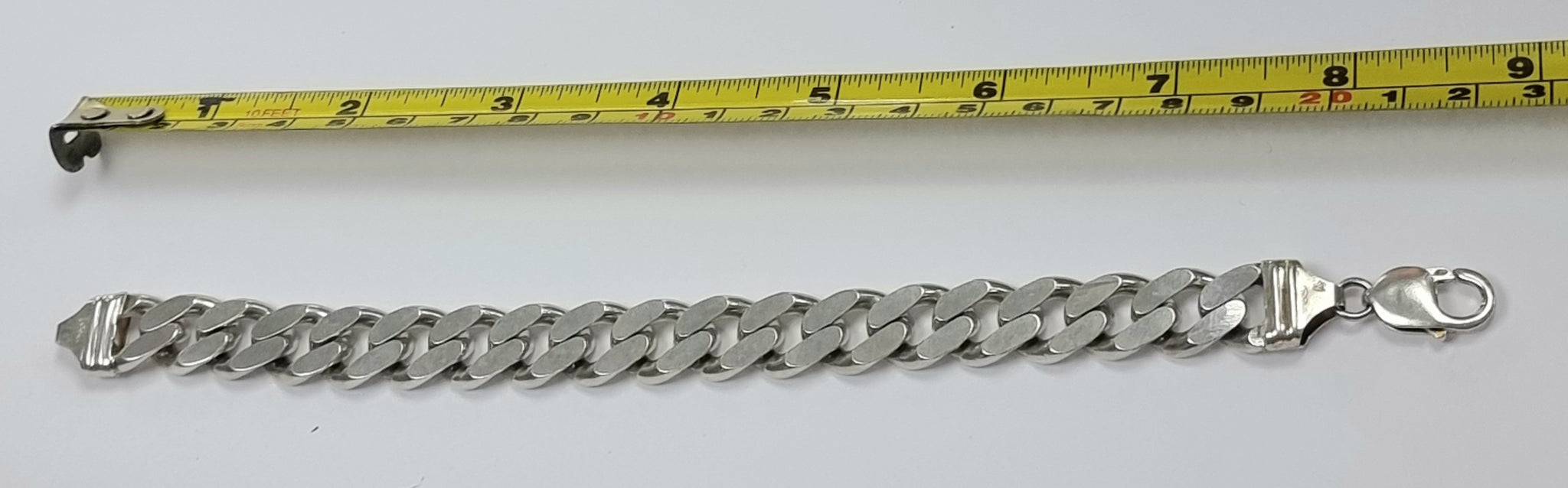A really chunky bracelet weighing a whopping 57.46 grams 9 inches long. The width is shown in the photographs