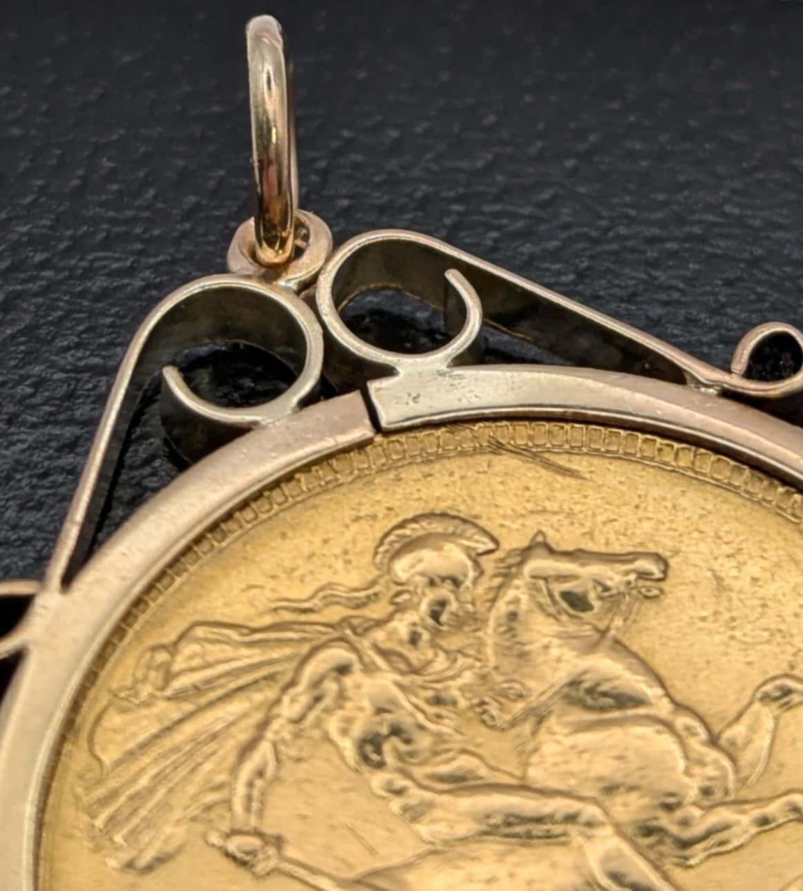 SOVEREIGN 22CT IN 9CT HOLDER, SLIGHT SPERATION AT TOP OF FRAME SLIGHT CUT AT TOP OF HOLDER, COIN IS STILL SECURE, GENERAL SIGNS OF BEING A PRE OWNED MAY ALSO BE VISABLE SUCH AS LIGHT MARKS HARPURHEY STORE