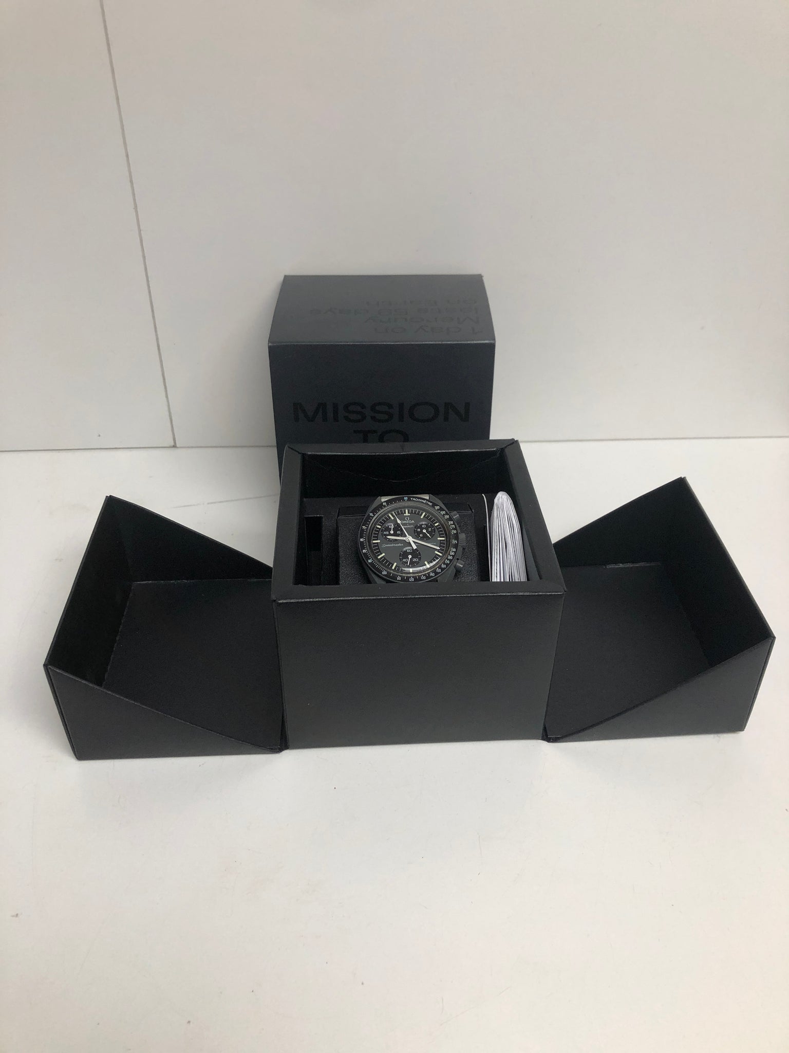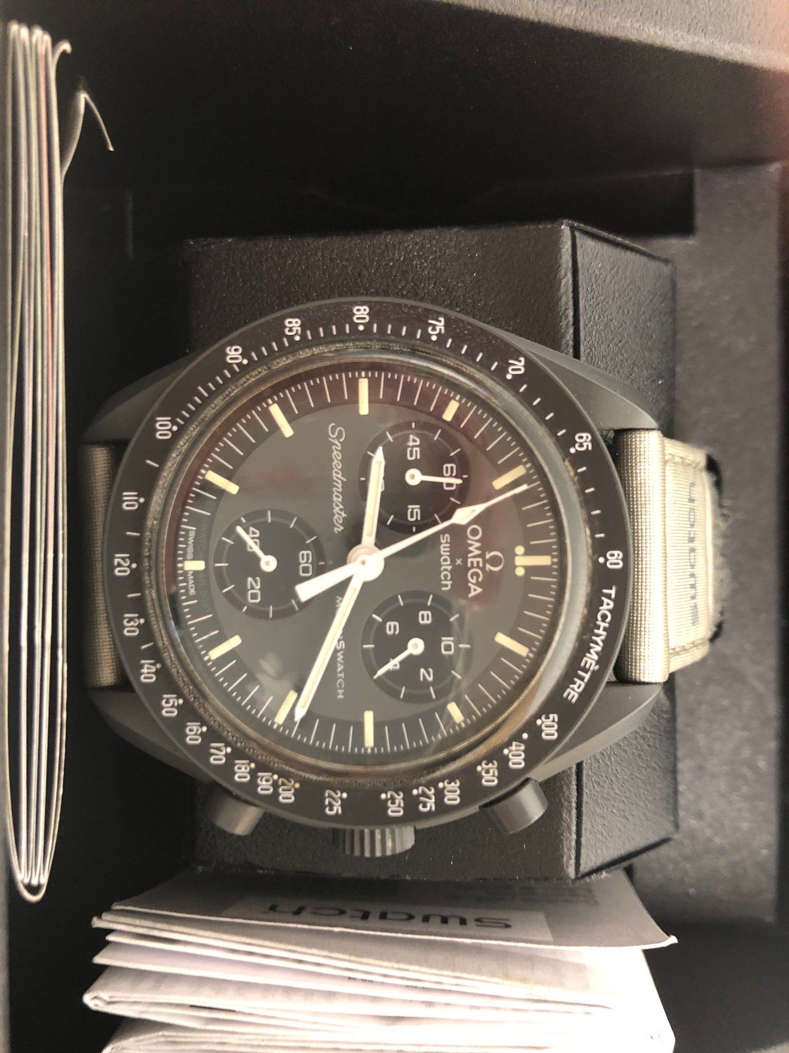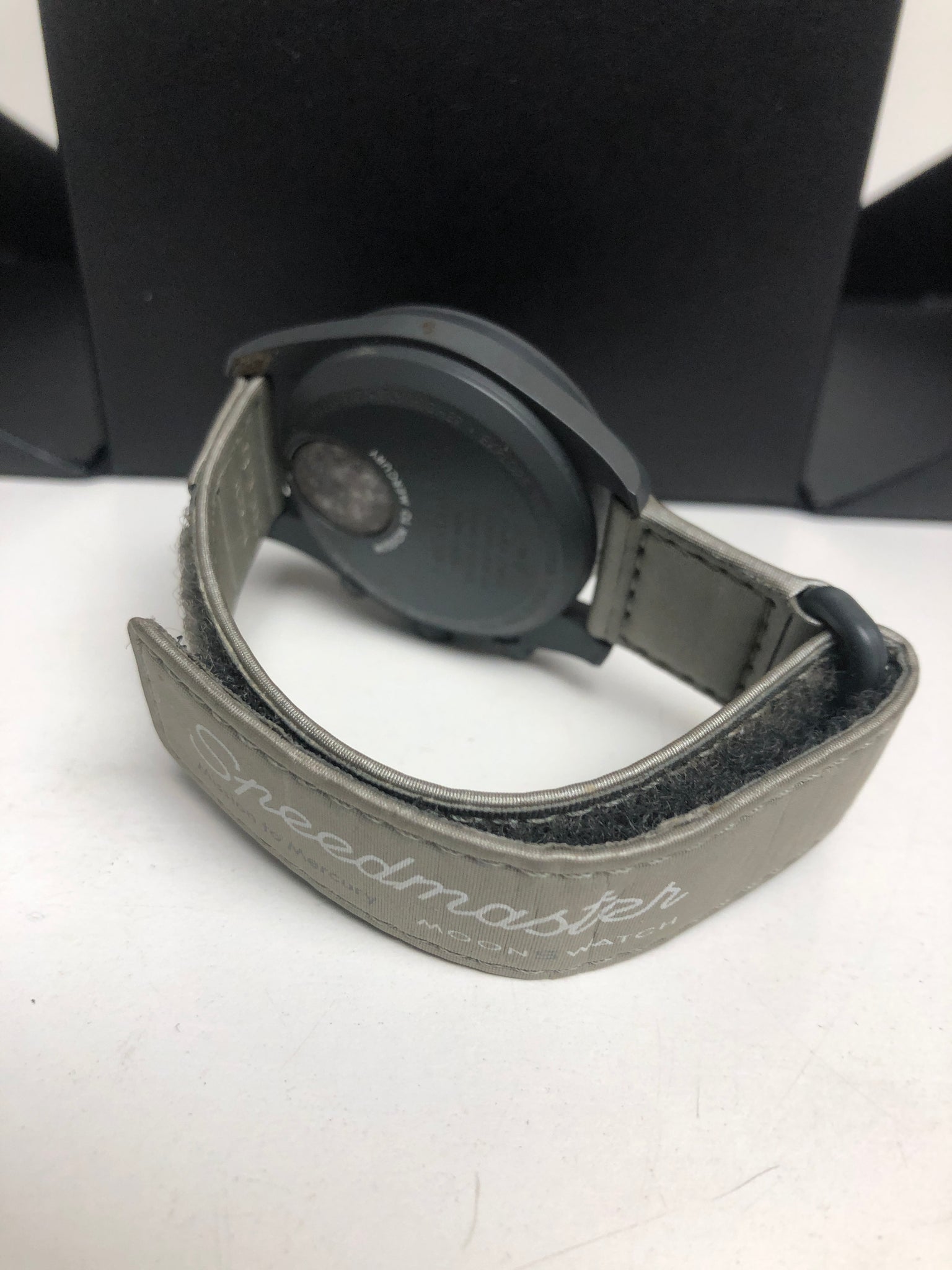 This steel gray non-limited watch is complete with a black VELCRO strap. All the hands and tachymeter scale are in white, just like in the original Moonwatch. The bezel is in black. All dials in the collection carry the OMEGA X Swatch branding, the iconic Speedmaster logo and the MoonSwatch logo. The biosourced glass construction, the etched "S" integrated in the center of the glass, the fine and sophisticated circular pattern on the dial outer ring and the recessed subdials, the angular and smooth lugs construction, the iconic “dot over 90” detail on the tachymeter scale, and of course the unique Bioceramic feel are common to all models. The hour, minute, and chronograph seconds hands as well as the hour markers sport Super-LumiNova for a perfect glow in the dark.