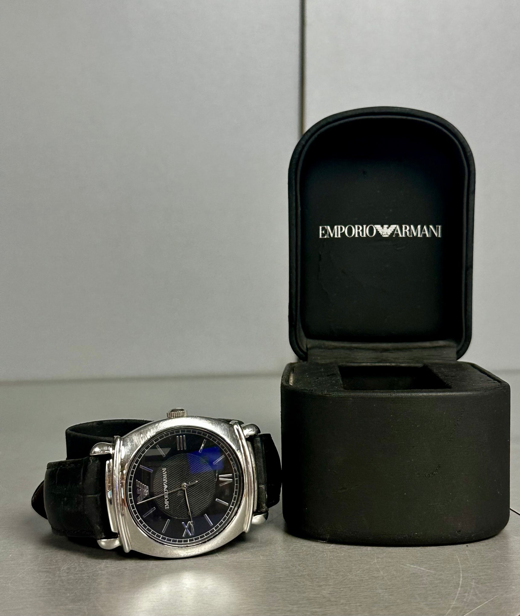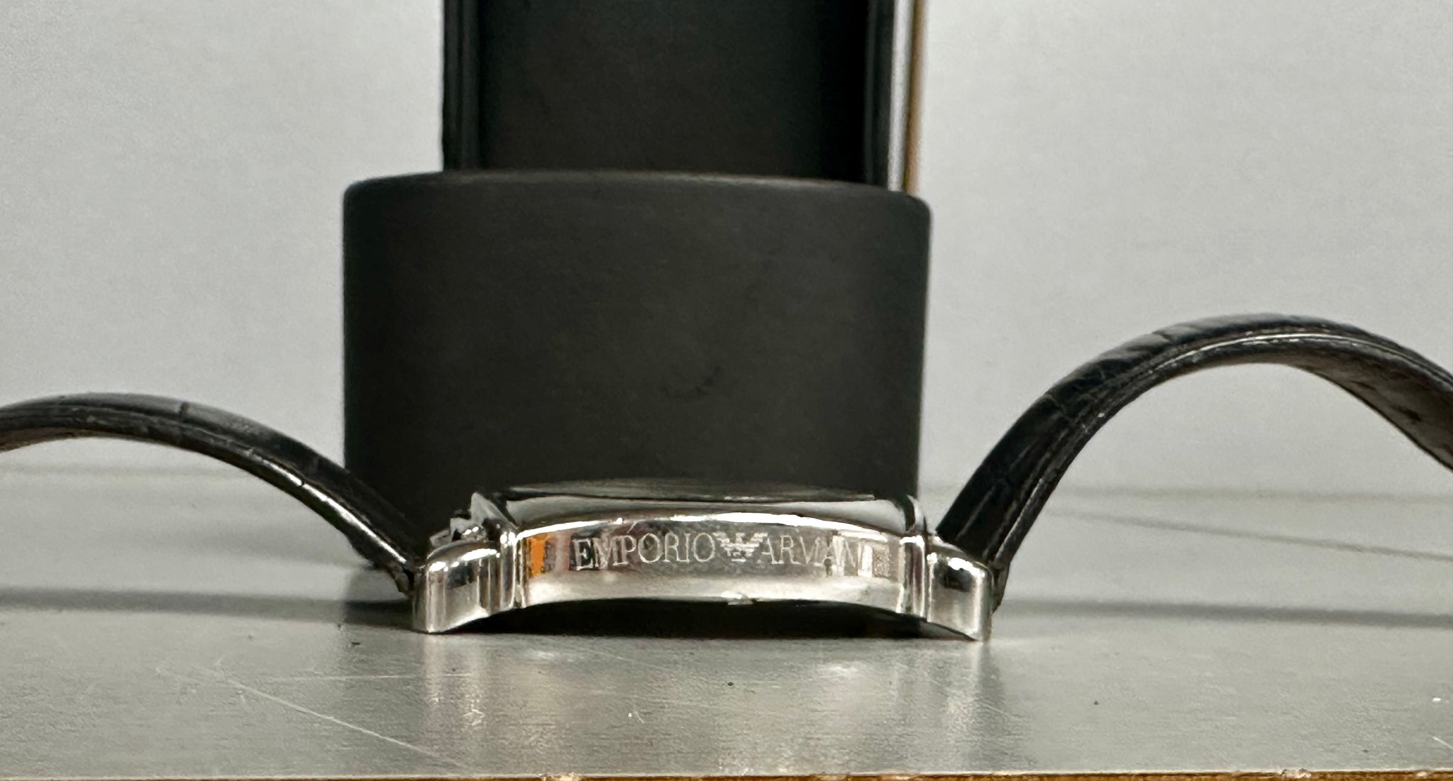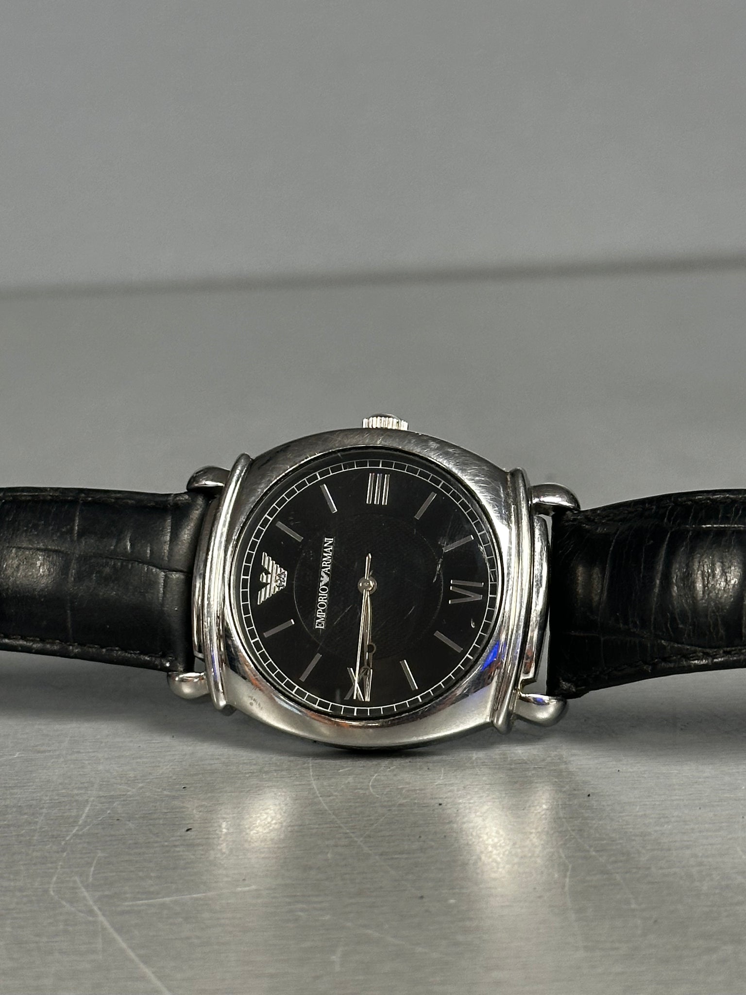 Genuine Leather Band Width 24 mm Diameter 42 mm Thickness 11 mm Water Resistance 50 Meters Design Giorgio Armani Movement Quartz (Battery)