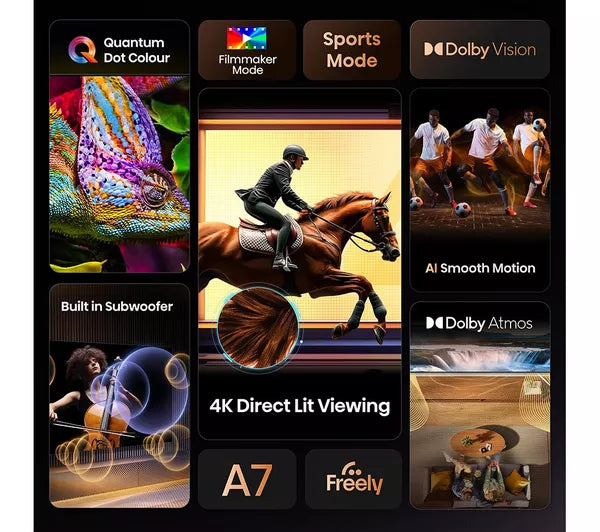 Over a billion shades are brought to life with Quantum Dot Colour on this Hisense A7Q 43" TV. It's not just vibrant, colours are served up in a true and natural way. The Directlit Full Array display precisely controls the contrast and brightness. That means deep blacks and bright highlights from edge to edge that are always on point. The Hi-View AI Engine is the brains of the operation, intelligently boosting the colours and contrast frame-by-frame. And Dolby Atmos has you covered for sound. It creates a virtual surround sound experience that makes you feel like you're right where the action is. Good to know - Freely brings you live TV channels and on-demand content over WiFi – no aerial, no fees, no hassle - Dolby Vision HDR boosts the contrast, so you'll see more details – like enemies lurking in the shadows - Keep up with the action thanks to AI Smooth Motion – it's great for sports and fight scenes - Filmmaker mode retains the original picture settings, so you can watch movies just like the director intended - Stream content from the likes of Netflix, Disney+, and NOW on the VIDAA smart platform