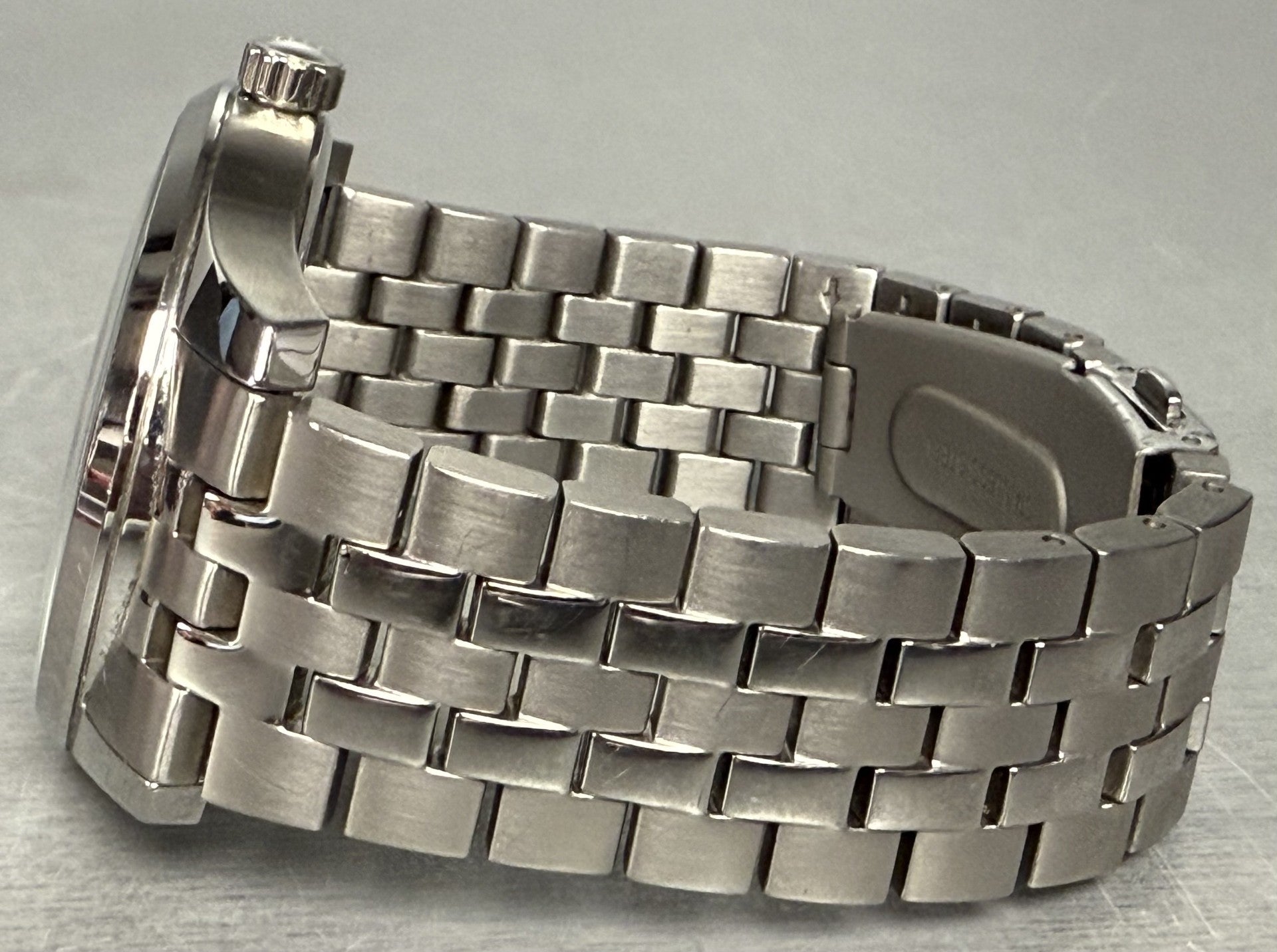 Used condition, all working. Come's boxed with a spare link and manual. Does have marks and scratches across the links. Is missing the insert for the watch.
