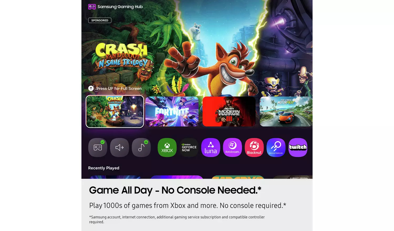 Experience a crystal clear picture and sound with this expertly engineered TV from Samsung – the World's best-selling TV brand. The U8000F offers intelligent 4K upscaling and picture enhancement, and sound that tracks the on-screen action for a truly immersive audio-visual experience, whatever content you are watching. This Smart TV is powered by Tizen OS, so you can watch your favourite digital TV channels, a huge collection of 4K films, and your catch-up TV apps - all secured by Knox for peace of mind. Samsung TV Plus provides instant access to thousands of TV shows and movies, all for free. Just connect to the internet and watch live and on-demand entertainment, news, sports highlights, kids shows, and more - no strings attached. Now that really is smart! Samsung Gaming Hub brings together the biggest console and streaming games from Xbox and others, straight to your Samsung TV. You don't need a console, and there are no downloads or storage limits - just turn on your TV and play. Game Pass and a compatible controller are required. Motion Xcelerator provides the smooth motion, and HDR powered by HDR10+ dynamically optimises every single frame in real time, so you can enjoy greater depth and detail in every scene. For a truly immersive viewing experience, you need great sound. As well as Object Tracking Sound Lite, this Samsung TV has Adaptive Sound technology to make sure you hear every detail. The Metal Stream Design of this TV takes inspiration from aircraft engineering, using a single sheet of metal to create a slim, seamless and modern aesthetic. With a smooth back and clutter-free cabling, it looks great from all angles.