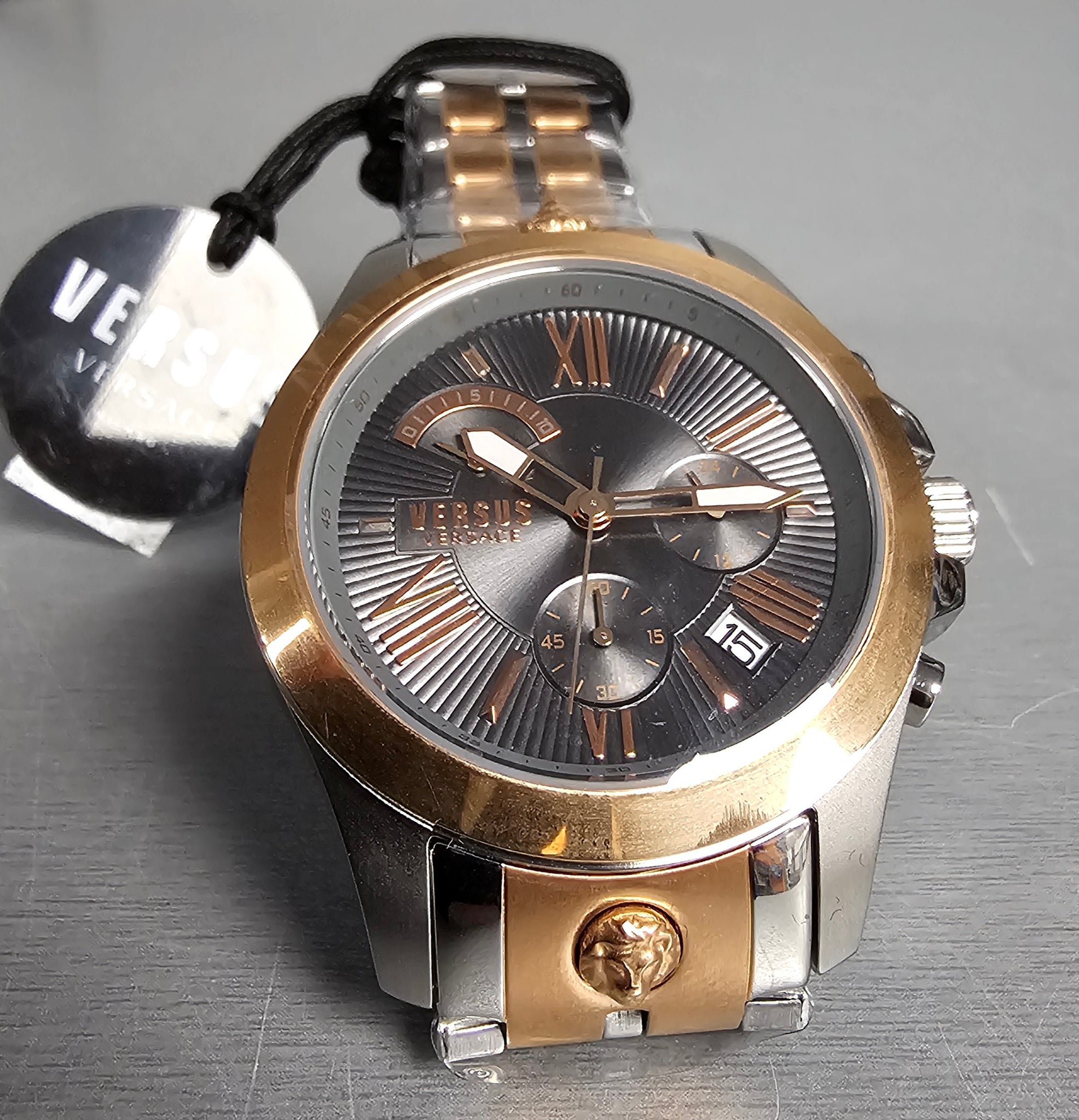 Category : Men's watches EAN : 7630030526916 Gender : Men's Dial color : Gray Strap color : Two-tone Strap material : Stainless steel Movement drive : Battery (Quartz) Waterproofness : 50M Dial : Analog Slide : Mineral Buckle : Folding buckle Brand : Versus by Versace Function : Chronograph , Date Model : Chrono Lion Case width (mm) : 45 mm