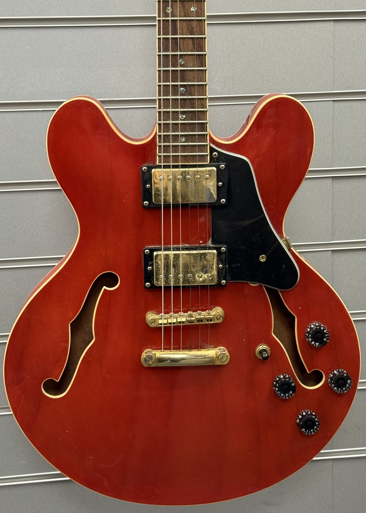 This is a stunning Westfield replica of the famous Gibson 335 for a fraction of the price. A serious instrument, the E7000 is, of course, superb for Jazz, as it was orignally intended, but over the years this style of guitar has excelled in soul, funk, rock and blues. Playing the E7000 is a a hugely satisfying experience, feeling the raw natural tone resonating through the body, and the rich sustain coming from the amp. Semi-acoustic ES shape double cutaway body with 'f' holes Floating black triple-ply scratchplate. Cream body binding. 22 fret maple neck with rosewood fingerboard inlaid with abalone dots. Gold hardware, Twin humbuckers, 3-a-side closed diecast machineheads, Separate addjustable bridge and tailpiece. Two volume and two tone controls, 3 position pickup switch Set Neck Westfield E7000 335 Style Electric Guitar - Thru Neck - Cherry
