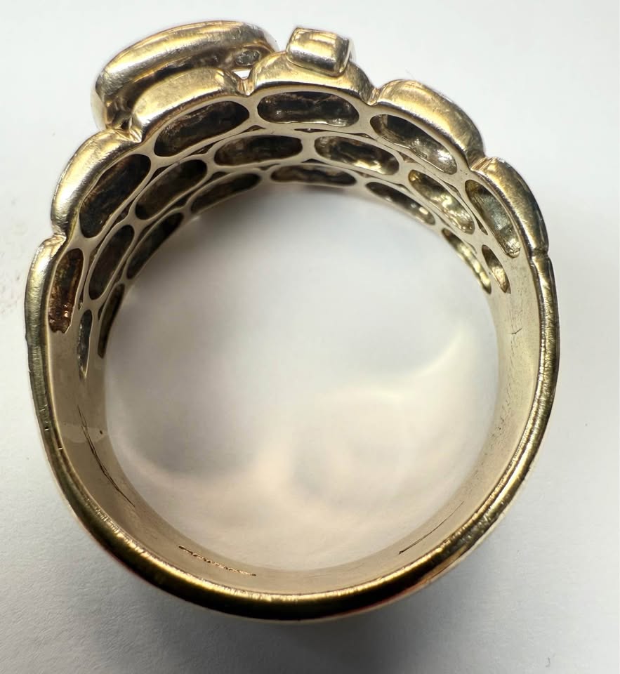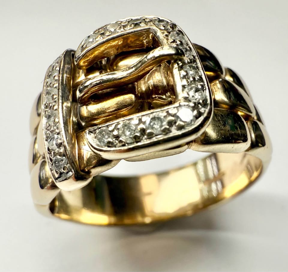 Good condition 9ct gold buckle ring with diamond, weighs 11.8 grams and is a size Y 1/2