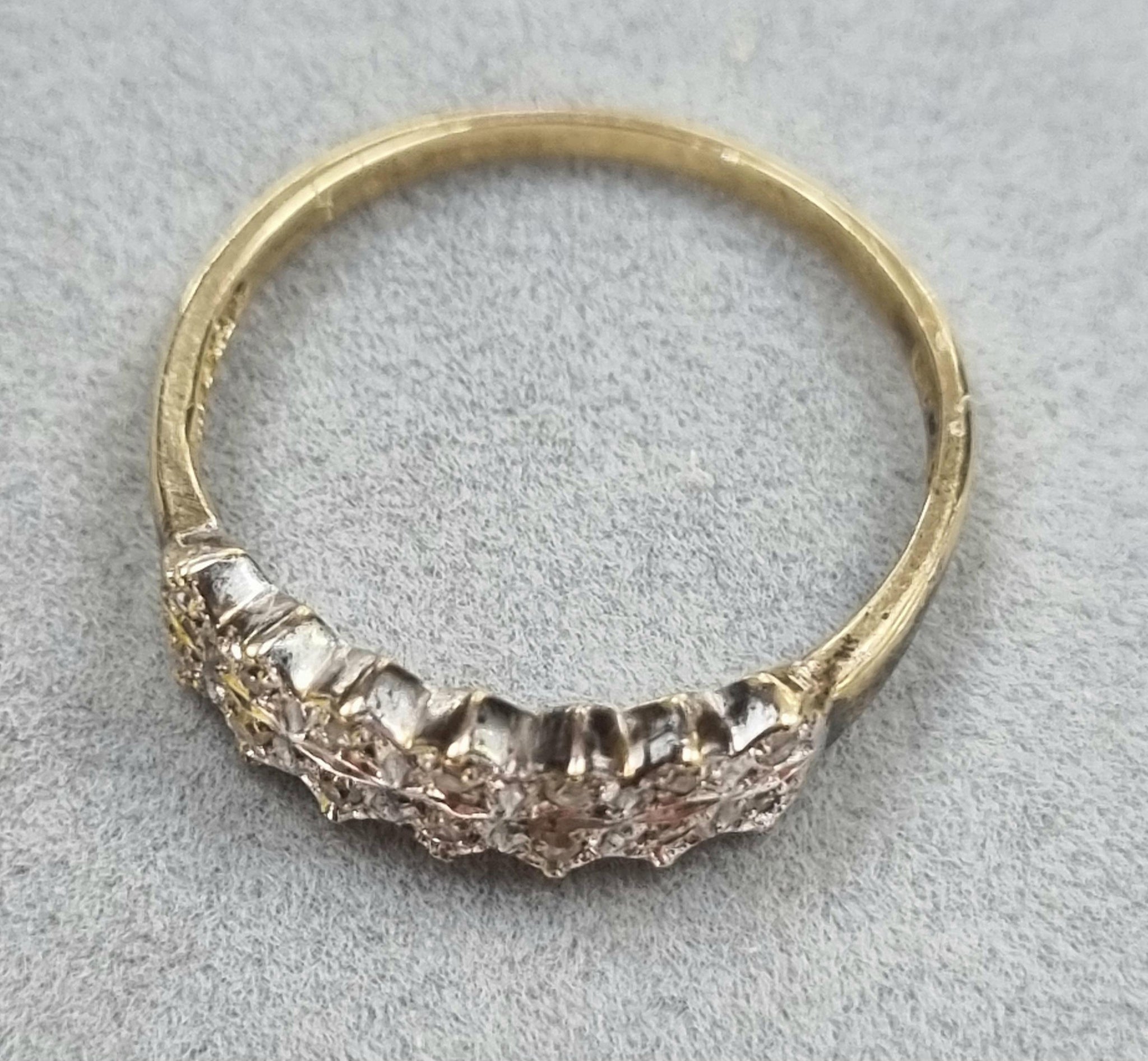 9ct gold ring with 2 rows of diamond chips 0.10ct set along the top. The ring is a size "N1/2" and weighs 1.86 grams.