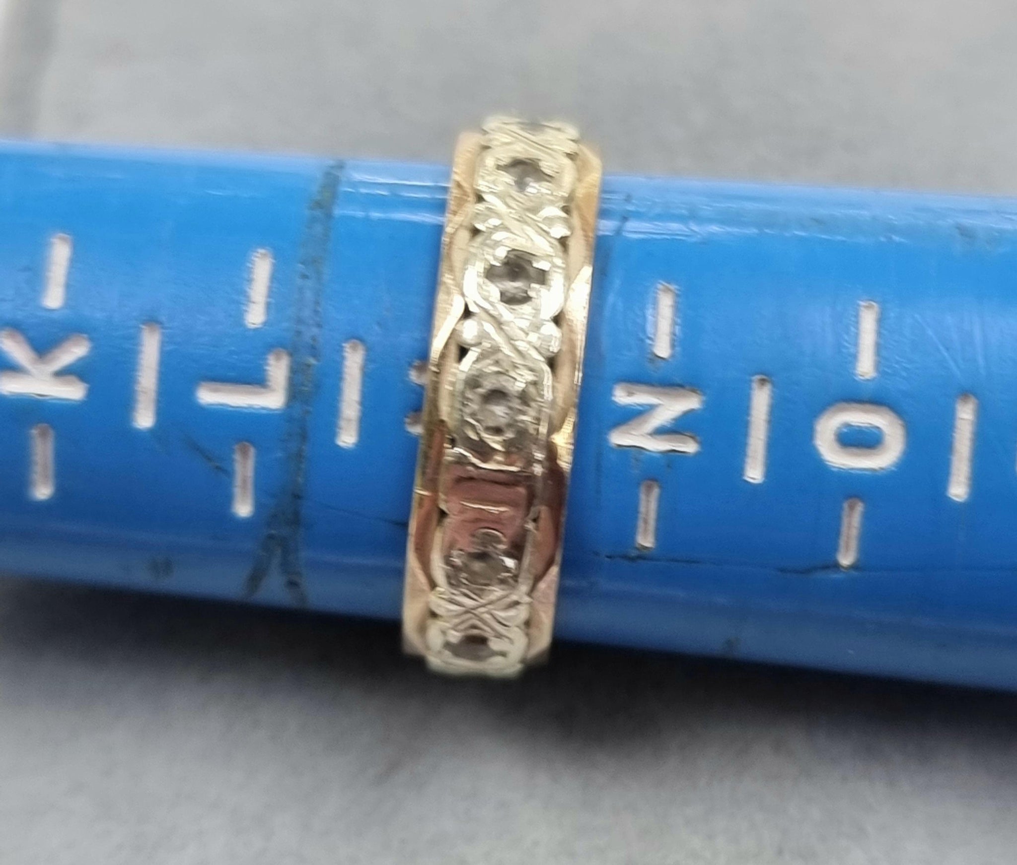 A pretty band in two tone with stones all way round .Size is an "M" it weighs 3.59 grams