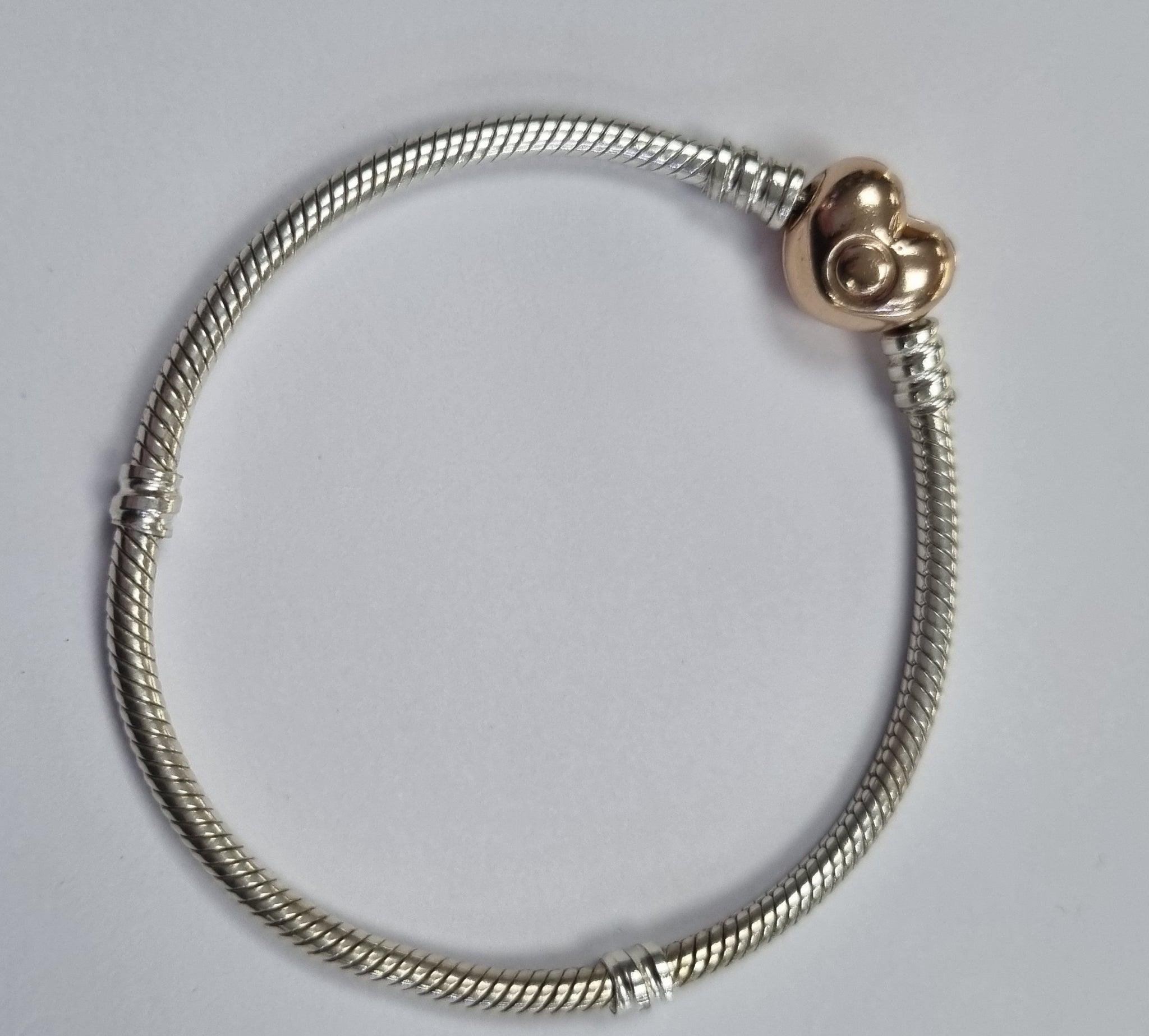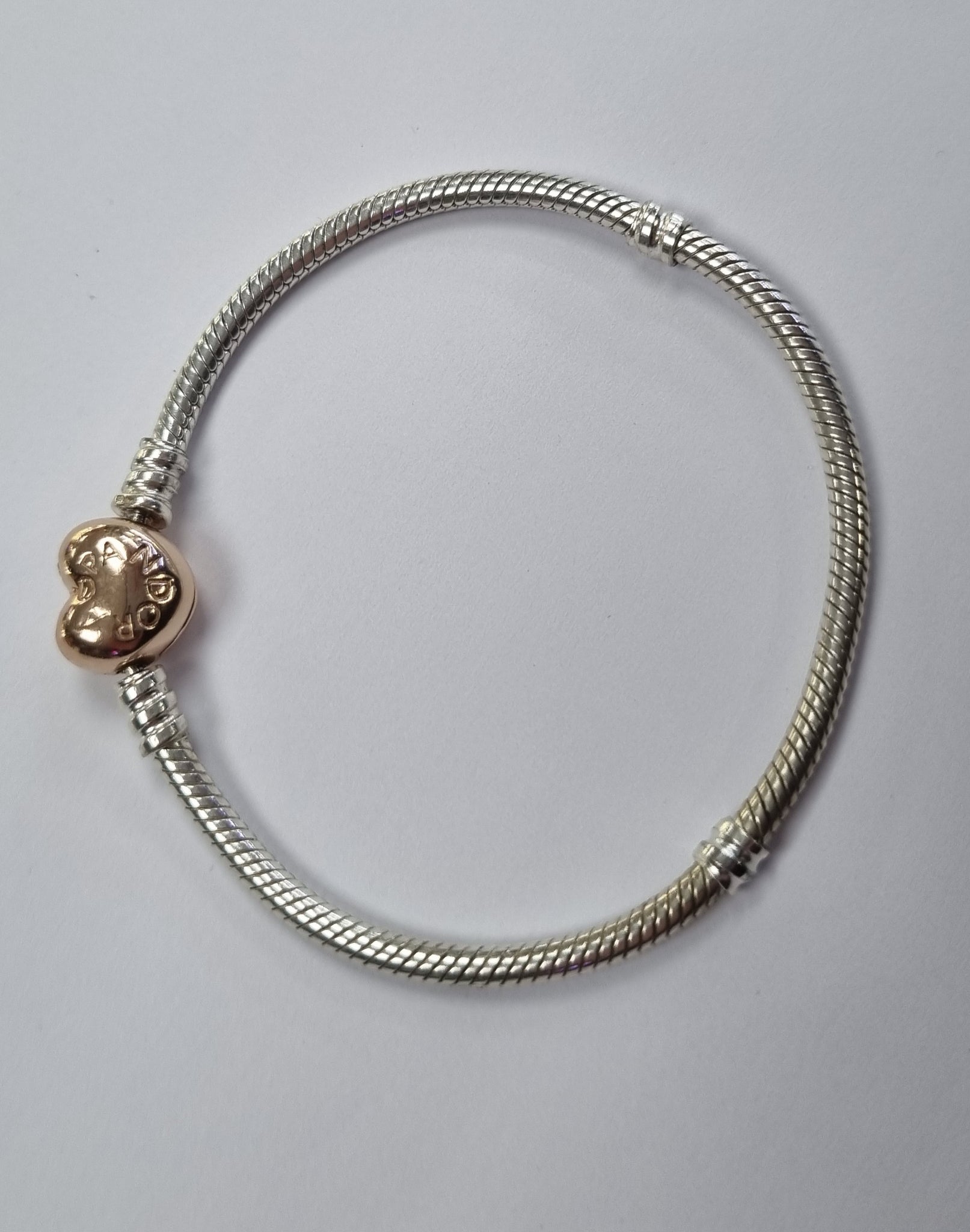 Pandora bracelet, this is silver, 17cm in good condition with a box. Small gold heart clasp 14k plated.