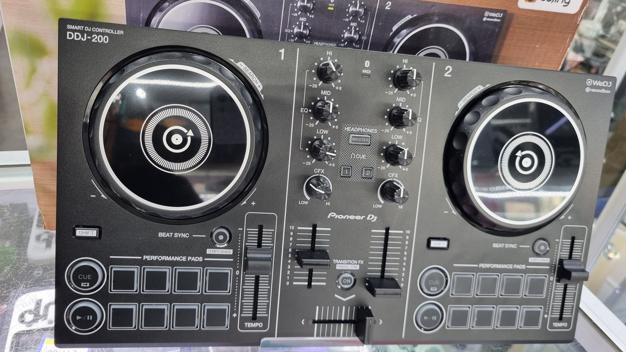 Pioneer Dj Smart controller DDJ -200. Comes in good condition with usb cable and an aux cable. This set up is Bluetooth compatible with Android and ios. Compatible with record box dj windows and mac. Download on app store. Comes in original box.