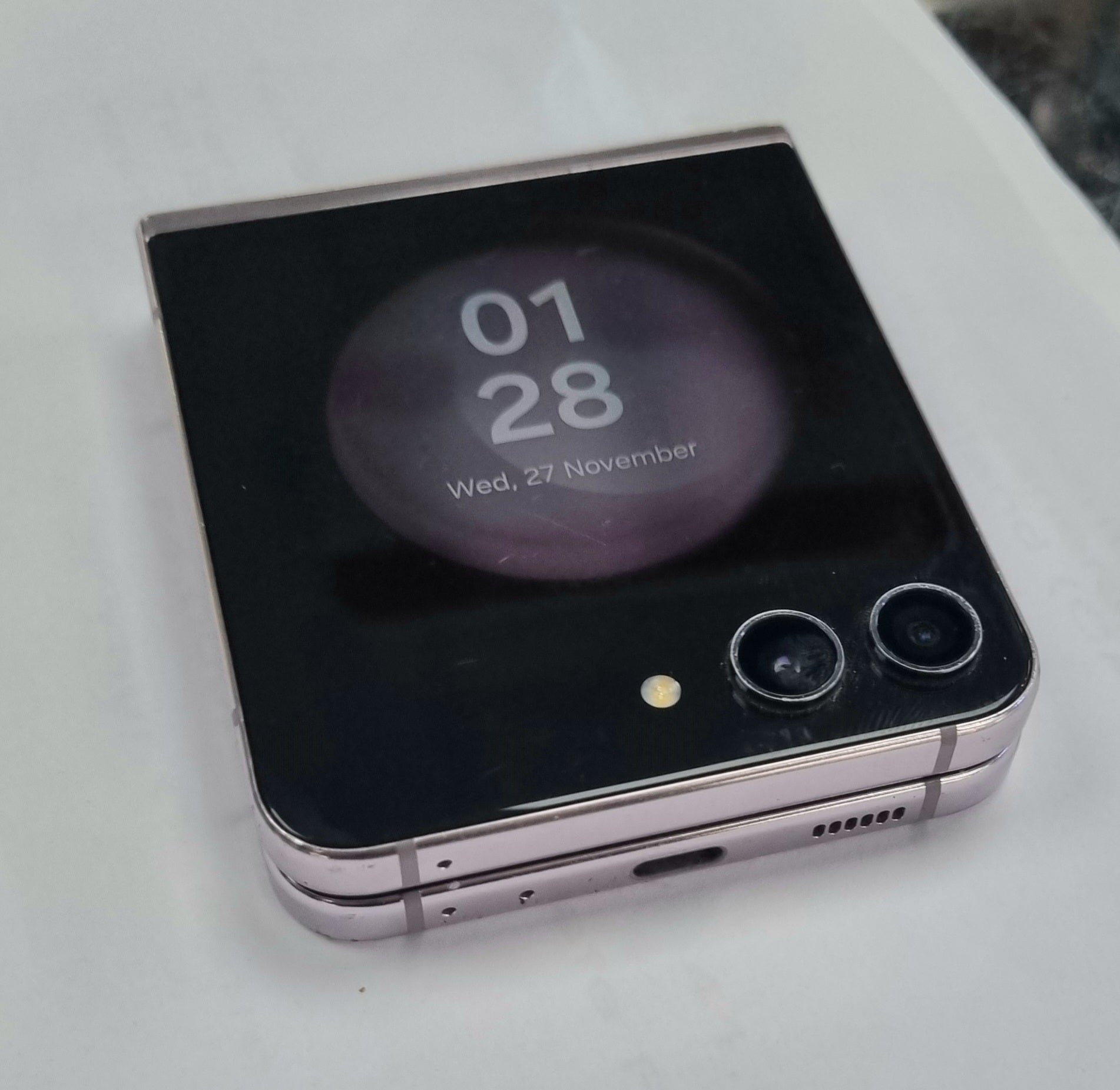 Samsung Galaxy Z Flip5 256gb in pink . * The front screen has some scratching inside screens are good* * Has a clear case on fully reset unlocked*