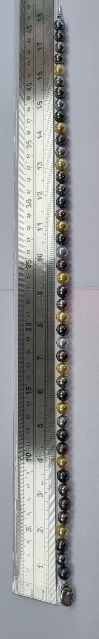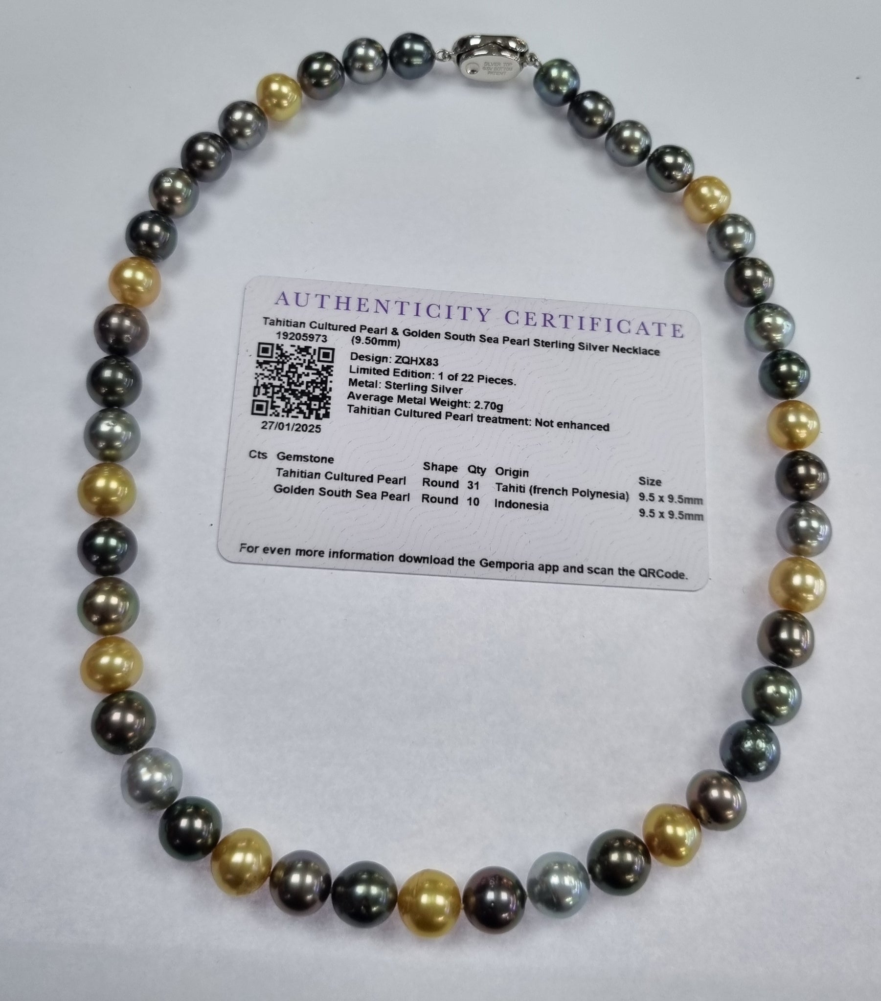 Limited Edition 1 of 22 pieces- Tahitian Cultered Pearl and golden South Sea Pearl Sterling silver necklace (9.50mm) Average metal weight is 2.70grams. Tahitian cultures Pearl treatment- not enhanced. Fantastic condition with original box and authentication certificate.