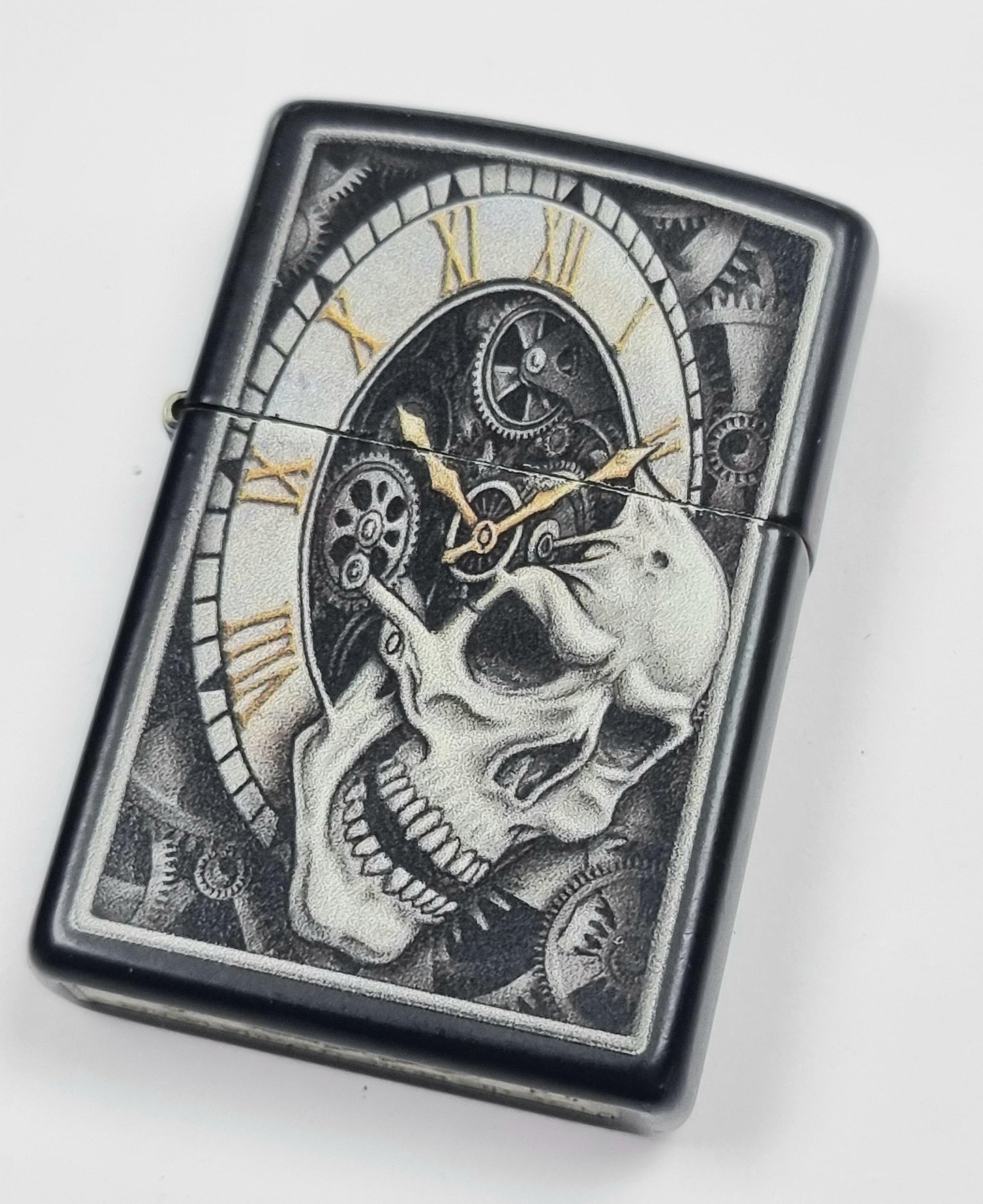 DescriptionZIP29854: Black Matte Zippo, Skull Clock DesignZippoTime is ticking. This Black Matte lighter features a grim design reminding us that the clock will never stop ticking. Zippo's in-house artists continue to produce spectacular original artwork to adorn the windproof lighter. This hand-drawn design was originally created with pen and ink, then carefully digitally-transferred to preserve the intricate layers of detail and shading to be reproduced with Zippo's color imaging process. Comes packaged in a gift box. For optimal performance, fill with Zippo lighter fuel.Zippo has been around since the early 1930s and has produced an unthinkable amount of lighters. From the traditional and collectible designs to modern and edgy, Zippo has had a model for just about everything. With such a wide range of styles and finishes to choose from, there is sure to be a Zippo to match any style.Zippo Manufacturing Company is the maker of the world-famous windproof lighter with the Lifetime Guarantee. Zippo windproof lighters enjoy a widespread and enviable reputation as valuable collectibles. Every Zippo lighter is made in the USA.