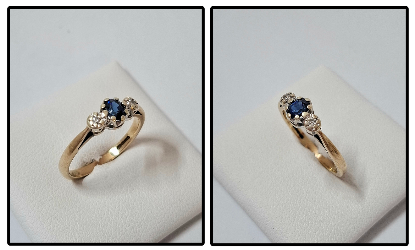 Beautiful 9 Carat Yellow Gold Ring - Stunning Blue Centre stone with Diamonds set on either Side - Full UK Hallmark - Diamond Stamp - Size N - Total weight with stones is 2.48 Grams - Unboxed