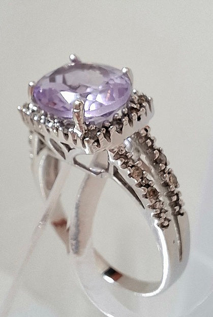 9 Carat White Gold Ring - Size N/O - This has a beautiful Lilac Centre stone surrounded by Sparkling smaller stones - Stamped for 9 Carat and Fully tested - Total weight including stones is 2.98 Grams - This item does not come with a box.