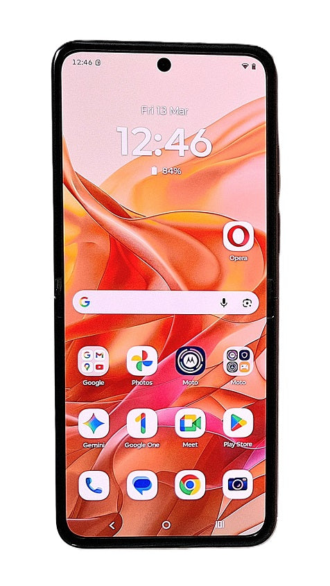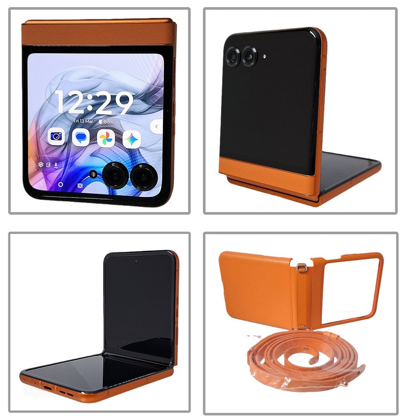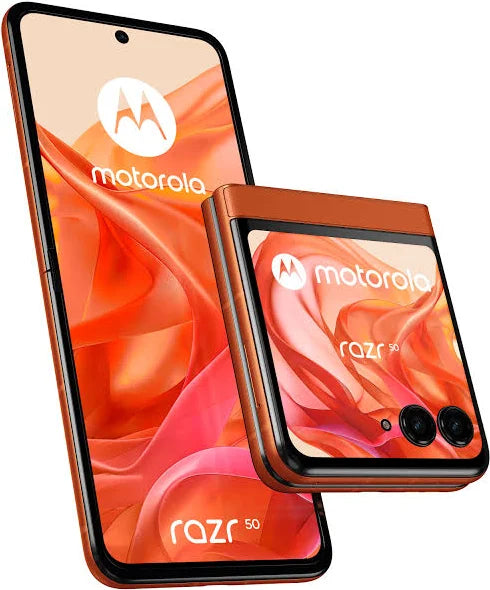 The Motorola Razr 50 5G in Orange Spritz is a 256GB/8GB RAM foldable smartphone running Android 16, featuring a 6.9" 120Hz pOLED main screen, a 3.63" external display, and a 4200mAh battery. It is powered by the MediaTek Dimensity 7300X processor and includes a 50MP main camera, IPX8 water resistance, and 30W