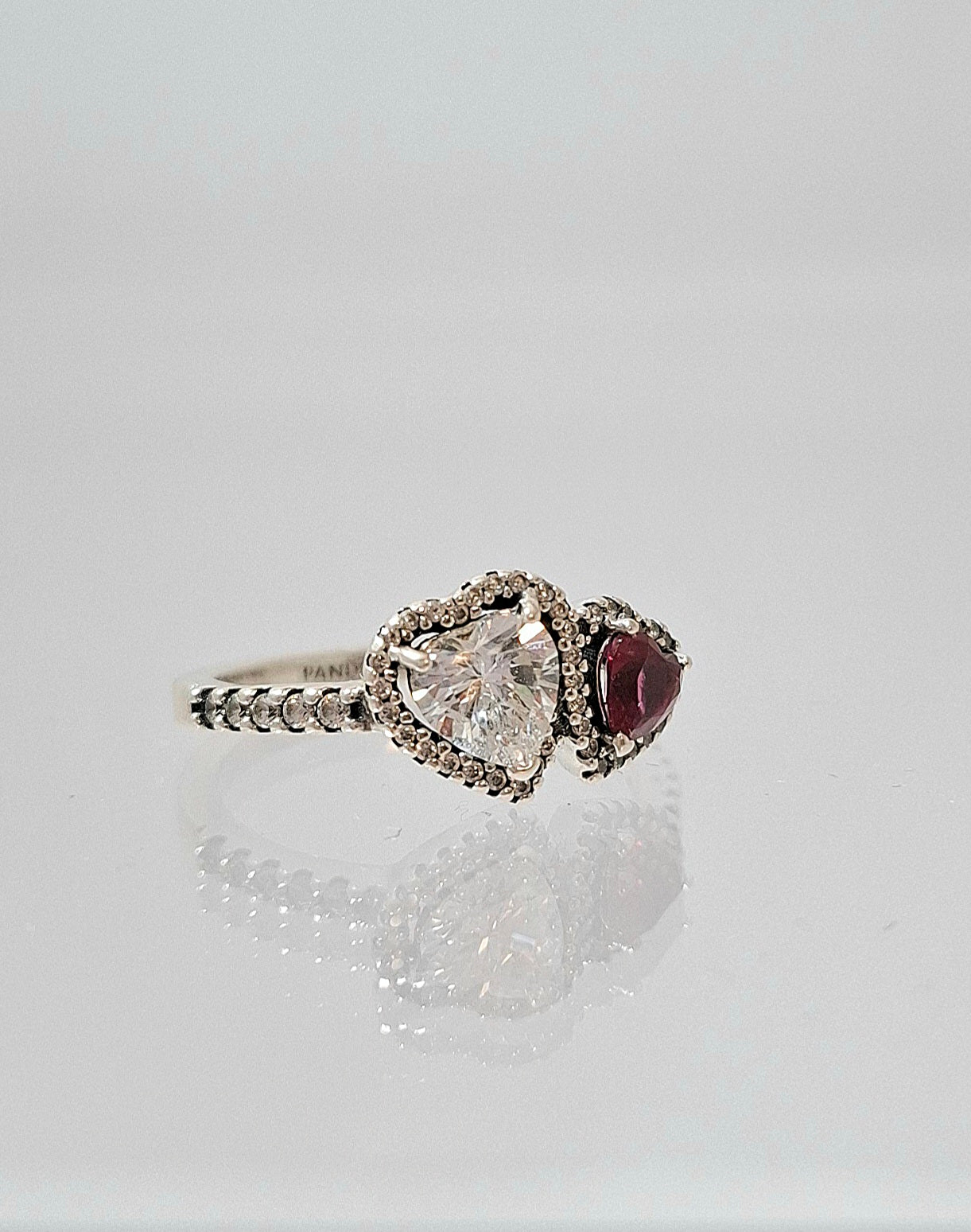 This sterling silver ring features two heart-shaped stones, one clear and one vibrant red, connected by a halo of shimmering pavé. With extra sparkle along the band, it's an eye-catching symbol of love and connection.