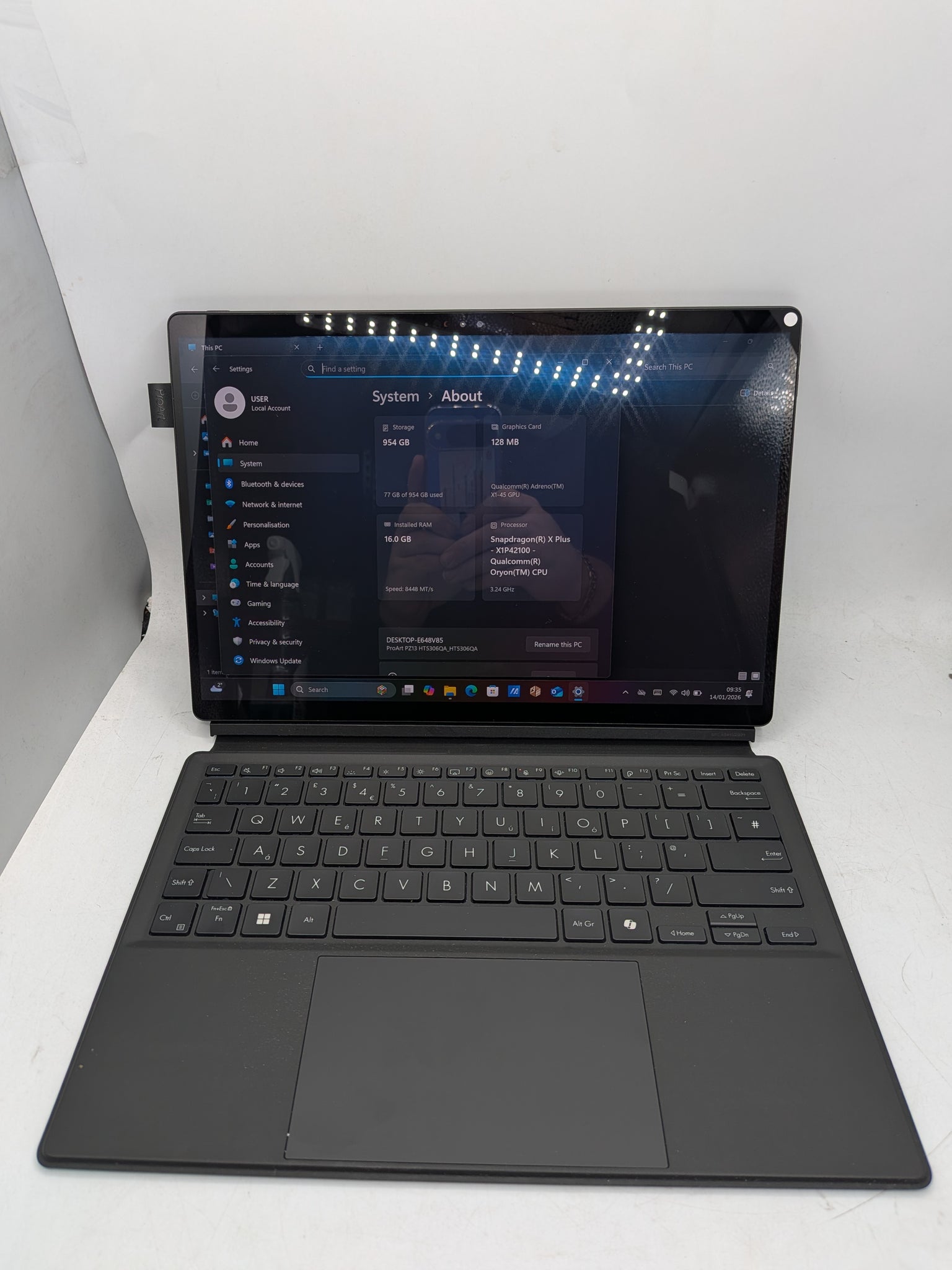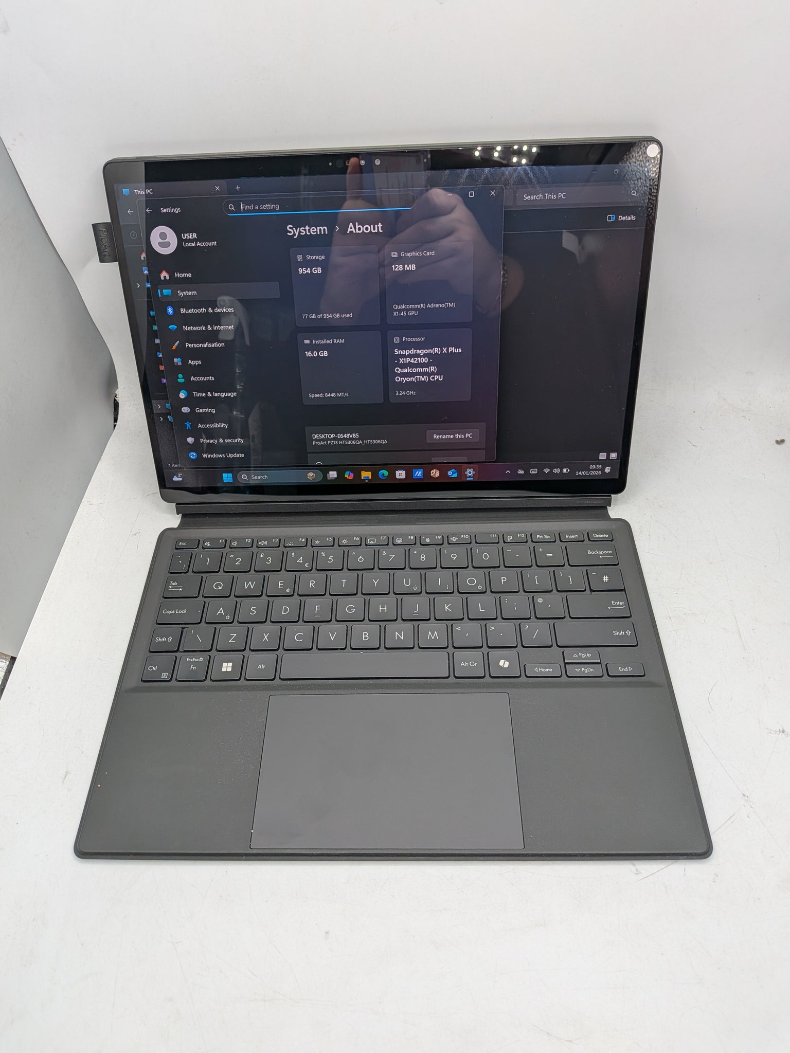 Pro Art PZ13 Creativity Unplugged, Anywhere with Copilot+ PC Introducing Pro Art PZ13, an IP52-rated and military-grade-tested detachable laptop for active creators that excels outdoors. Its OLED touchscreen gives you an incomparable viewing experience, and it’s powered by Snapdragon X Plus processor with 45 TOPS NPU that unleashes AI-enhanced creativity without sacrificing battery life. Versatile accessories to boost productivity include a detachable keyboard and ASUS Pen 2. 0. A full set of I/O ports, including an SD slot with a micro SD adapter, simplifies device connectivity and photo transfers. Its slim & light build marries advanced tech with a superior user experience, making creativity accessible to everyone, everywhere. in full working order with original charger in immaculate condition. 1TB storage 16GB RAM Windows 11 home Snapdragon x plus