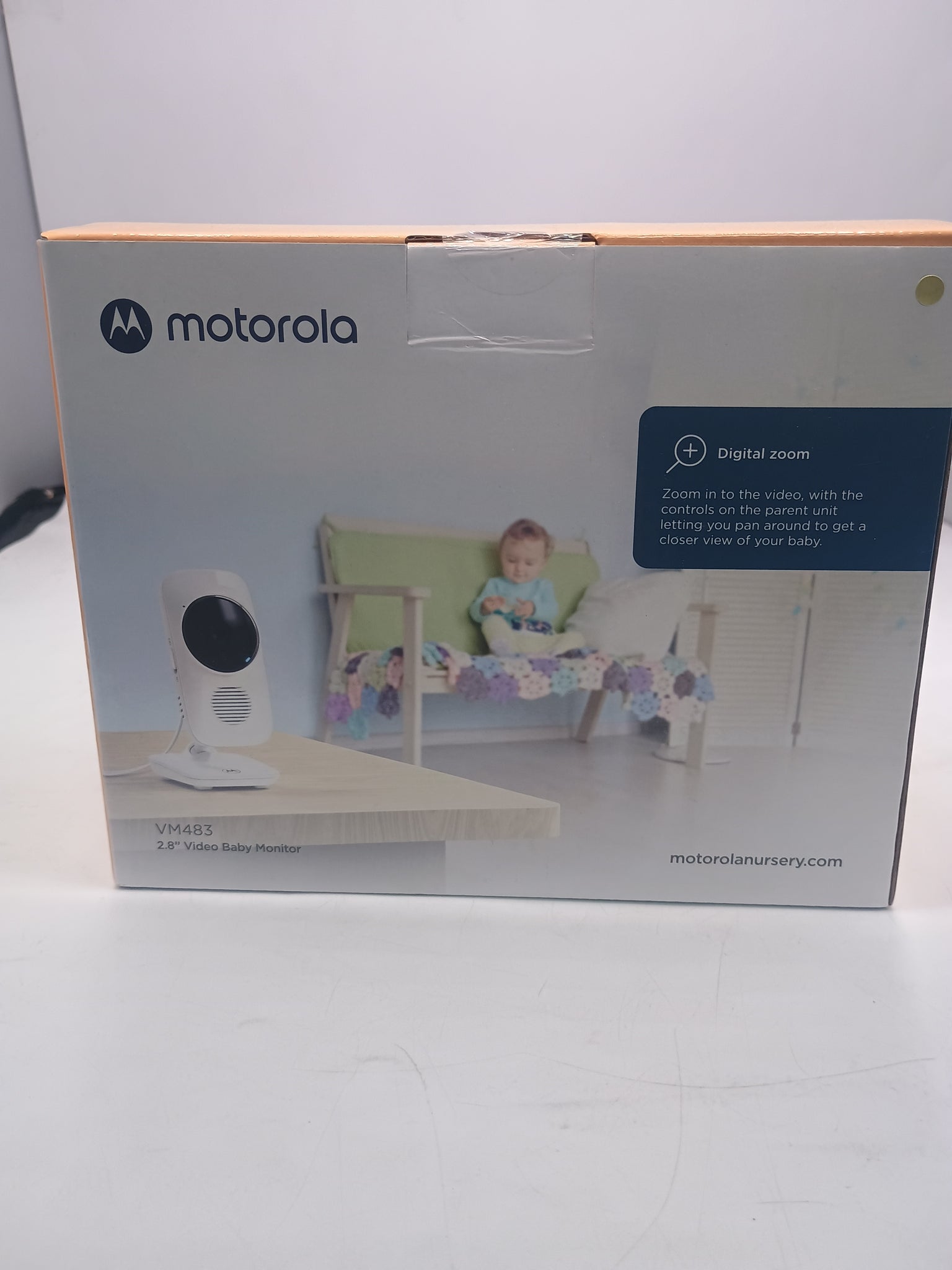 With the Motorola VM483, you can easily keep an eye on your child. Via the parent unit with a color screen, you can see exactly if your child is sleeping or awake. You can zoom in the camera remotely, so you always have a good view. Thanks to the infrared night vision, you also see well in the dark. With the 2-way audio, you can comfort your children remotely. On a full battery, the parent unit lasts 5 hours wirelessly. The VOX function only turns on the screen when your child makes a noise. This way, you save power. The noise level lights indicate how loud the sound is. You can even see the temperature in the children's room on the parent unit. Fully Boxed, never been used excellent condition, 2.8" video baby monitor