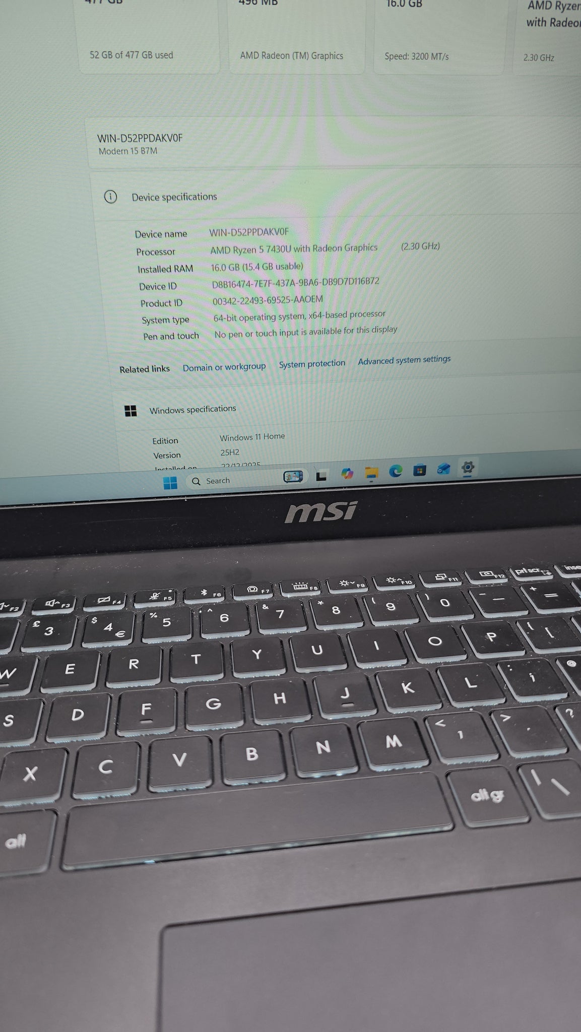msi modern 15 b7m amd ryzen 5 radeon graphics 500gb ssd 16gb ram unboxed, good condition