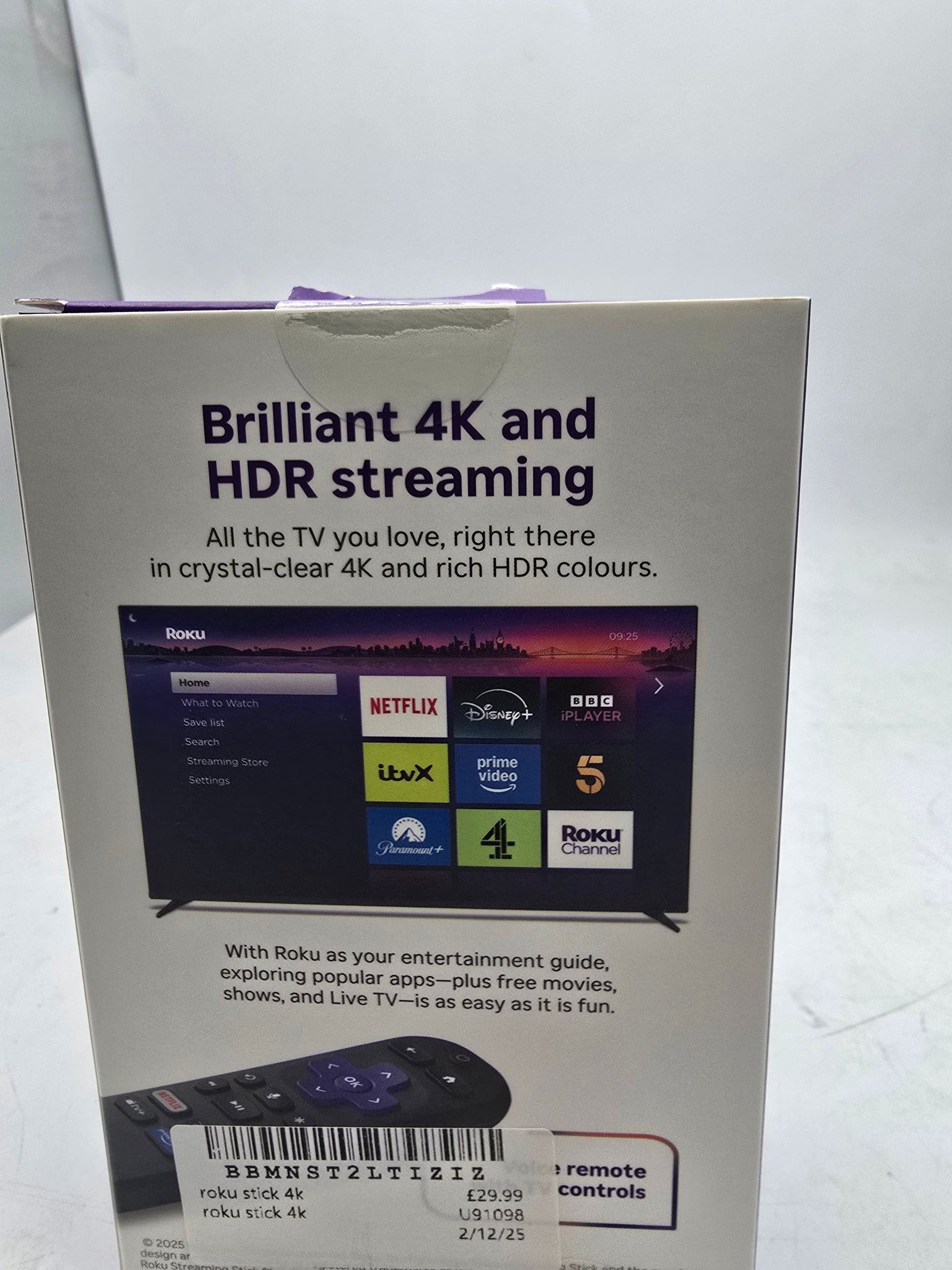 Transform your TV viewing with the Roku Streaming Stick Plus, the simplest way to upgrade any 4K TV to a premium entertainment hub. This sleek HDMI device delivers brilliant 4K Ultra HD picture quality with vivid HDR colour, bringing your favourite shows and movies to life. No need to juggle remotes - the included Roku Voice Remote lets you control TV power, adjust volume, and search using your voice. Plus, with access to Canada's #1 TV streaming platform, enjoy endless entertainment from available apps, free channels, and live TV, all from a compact device that powers directly from your TV and stays out of sight. sealed in box3