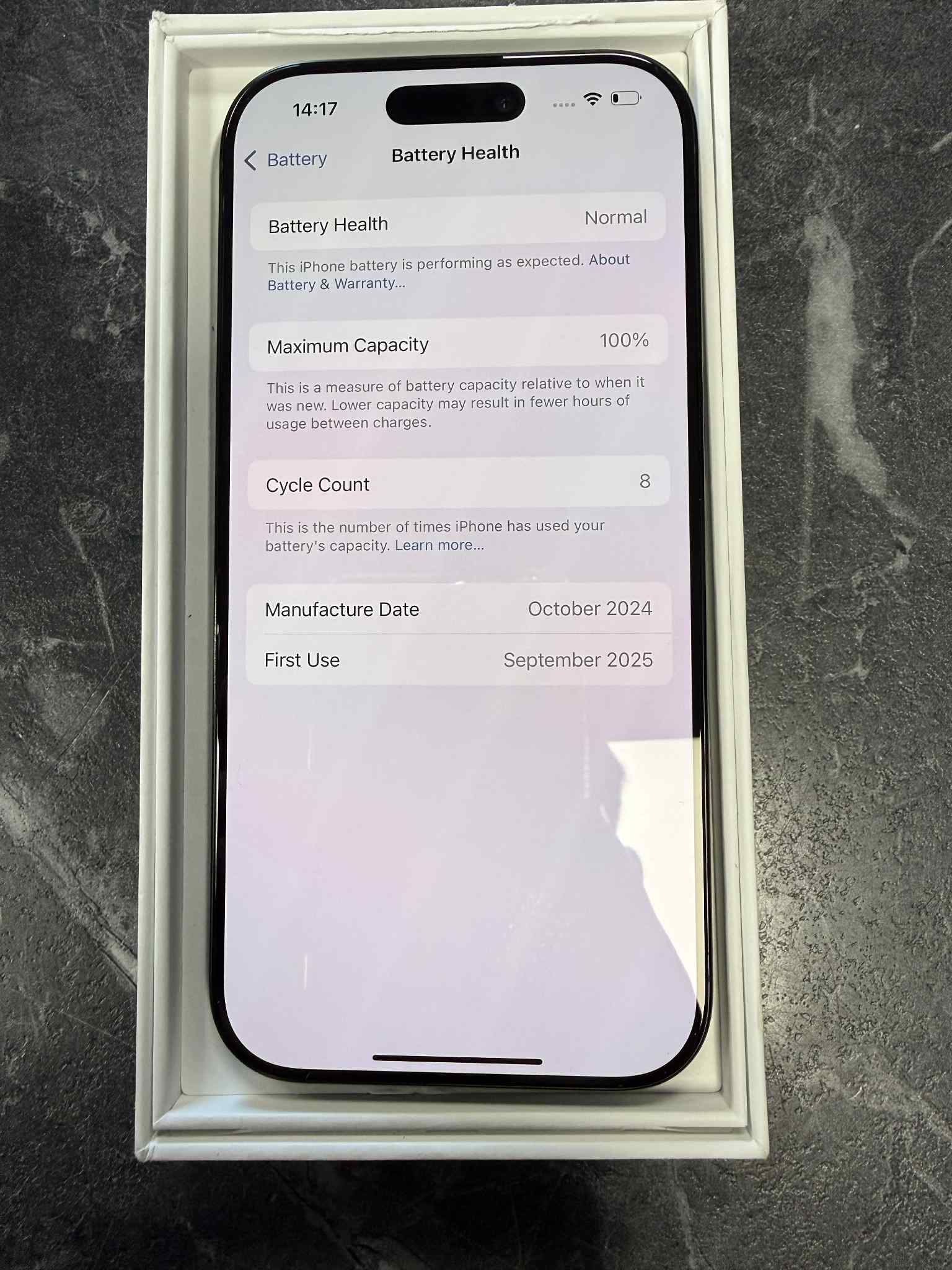 This is a Pre-Owned Apple iPhone 16 Pro which is Unlocked to all networks and has a 128GB Storage Capacity with the Battery Health remaining at 100% with a Count Cycle of 8 times. This is in Pristine Condition with no scratches or marks on the screen, back or body, it has also been fully tested and it is working perfectly with no defects. It comes with the original box but does not have the charger included with this product. Free UK Delivery Any item over £50 will be sent out Royal Mail Special Delivery or Fedex (depending on size and weight of package) for next working day delivery Any items under £50 will be sent out by Royal Mail 2nd Class for delivery between 3 and 5 working days All orders made before 11AM will be sent out the same working day Please note that deliveries to Ireland, Highland of Scotland and the Isles may take longer to arrive.